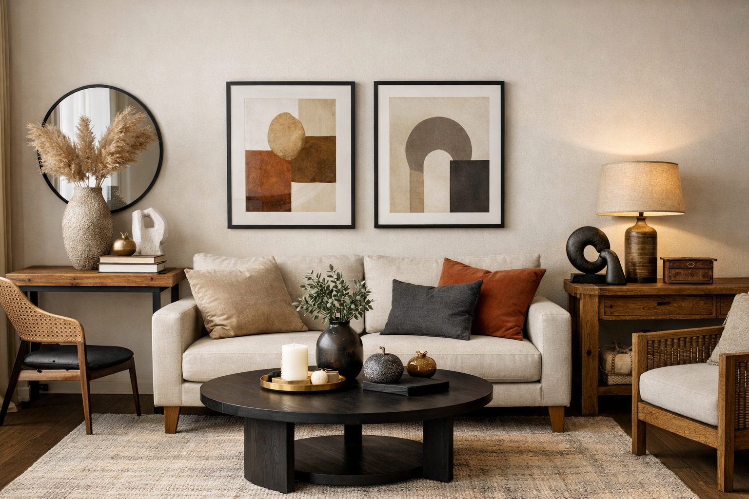 Base contemporánea. Añades una mesa de madera maciza o una pieza vintage. Ese contraste genera identidad sin romper la coherencia.