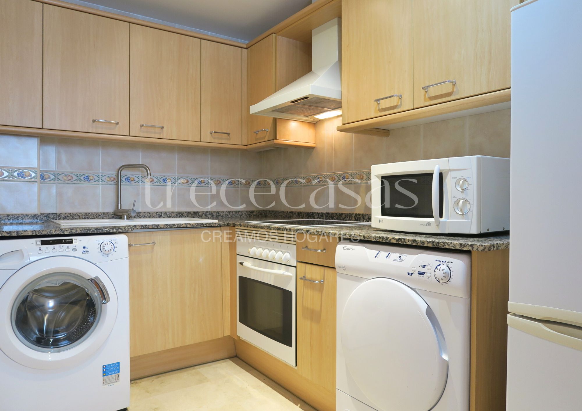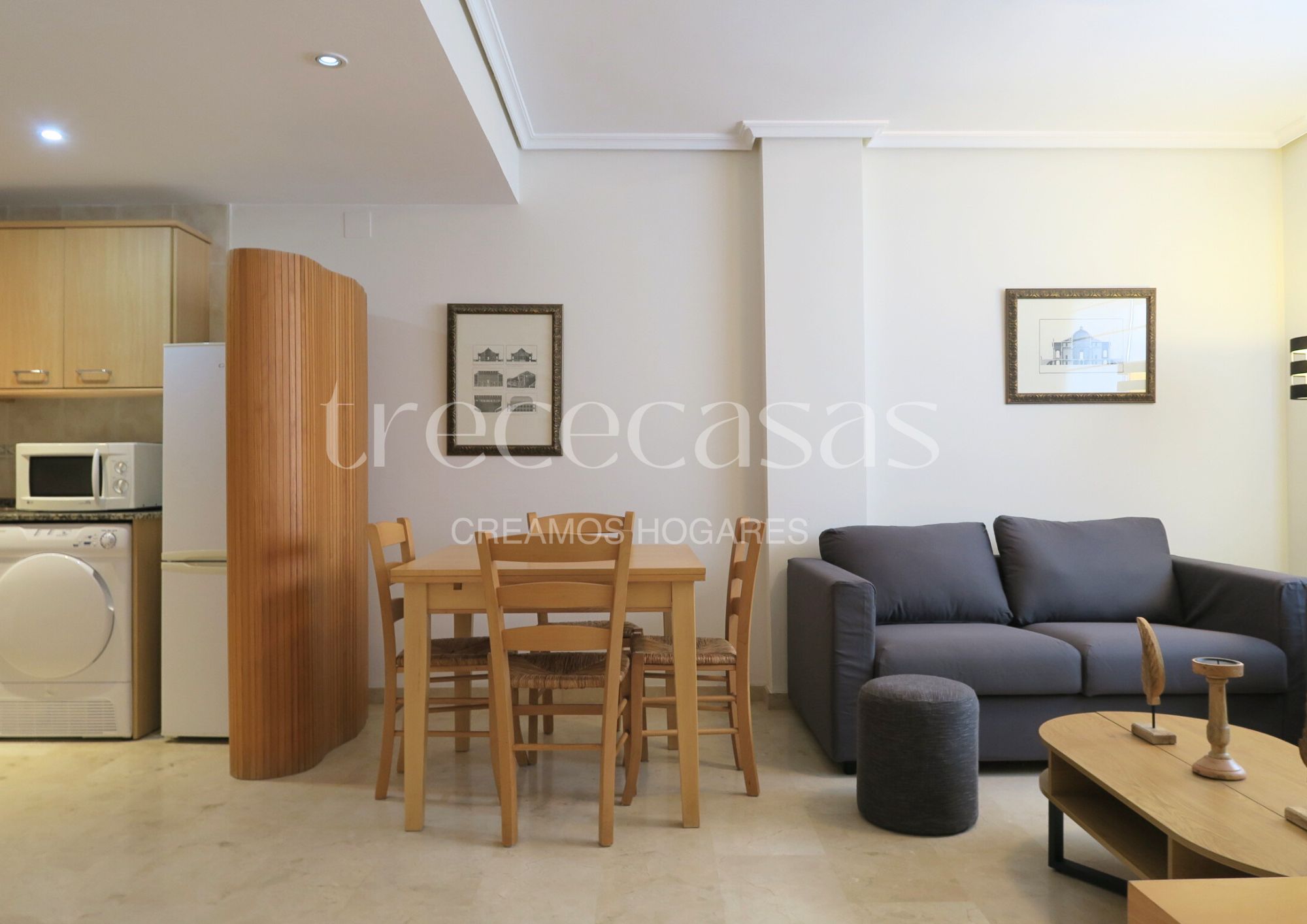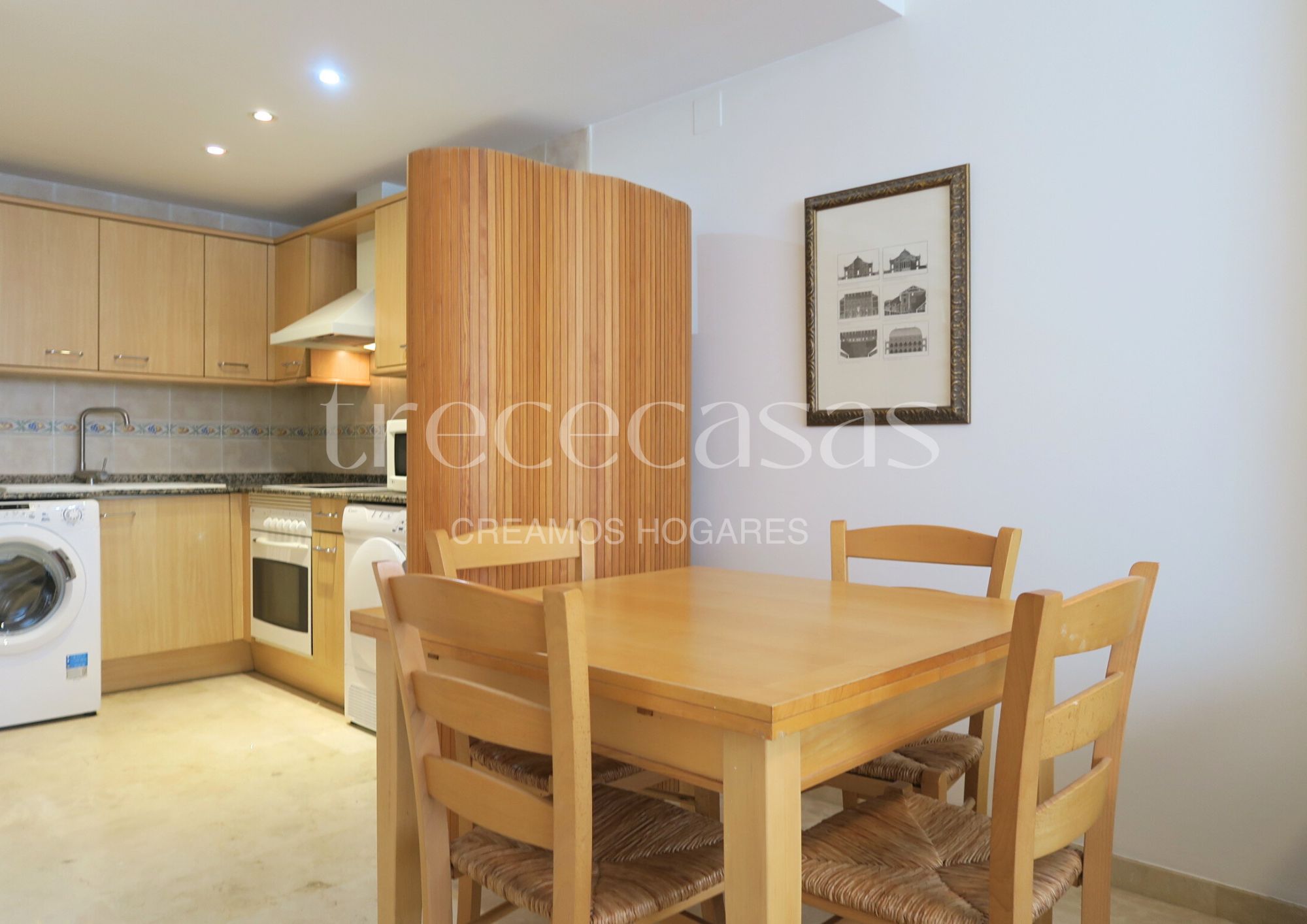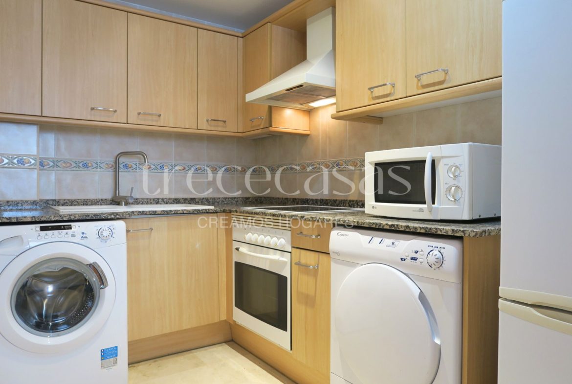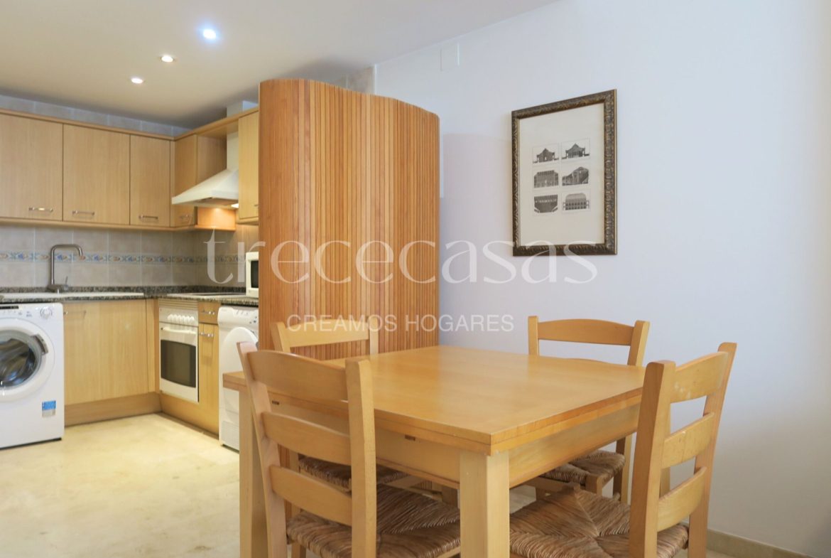 La zona de día está compuesta por un salón comedor amplio y luminoso, un espacio versátil que invita a descansar o a compartir. La cocina americana, completamente equipada, se integra con naturalidad en el ambiente, creando una sensación de amplitud y fluidez.