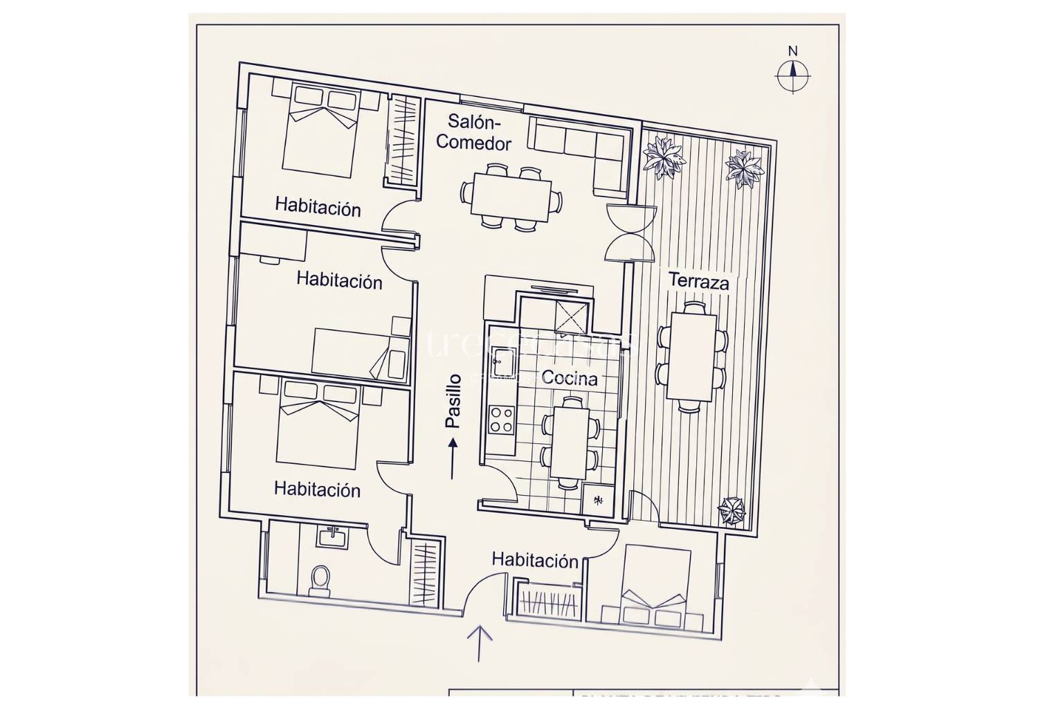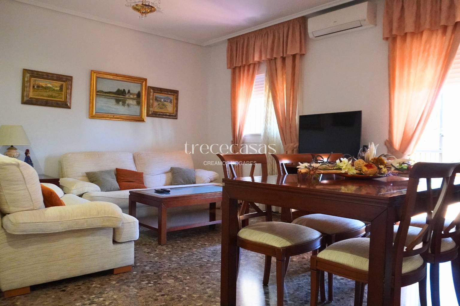 Desde la entrada se percibe amplitud. El salón conecta con el exterior y genera una relación directa con la terraza. Por lo tanto, el espacio resulta práctico y agradable para el uso diario.