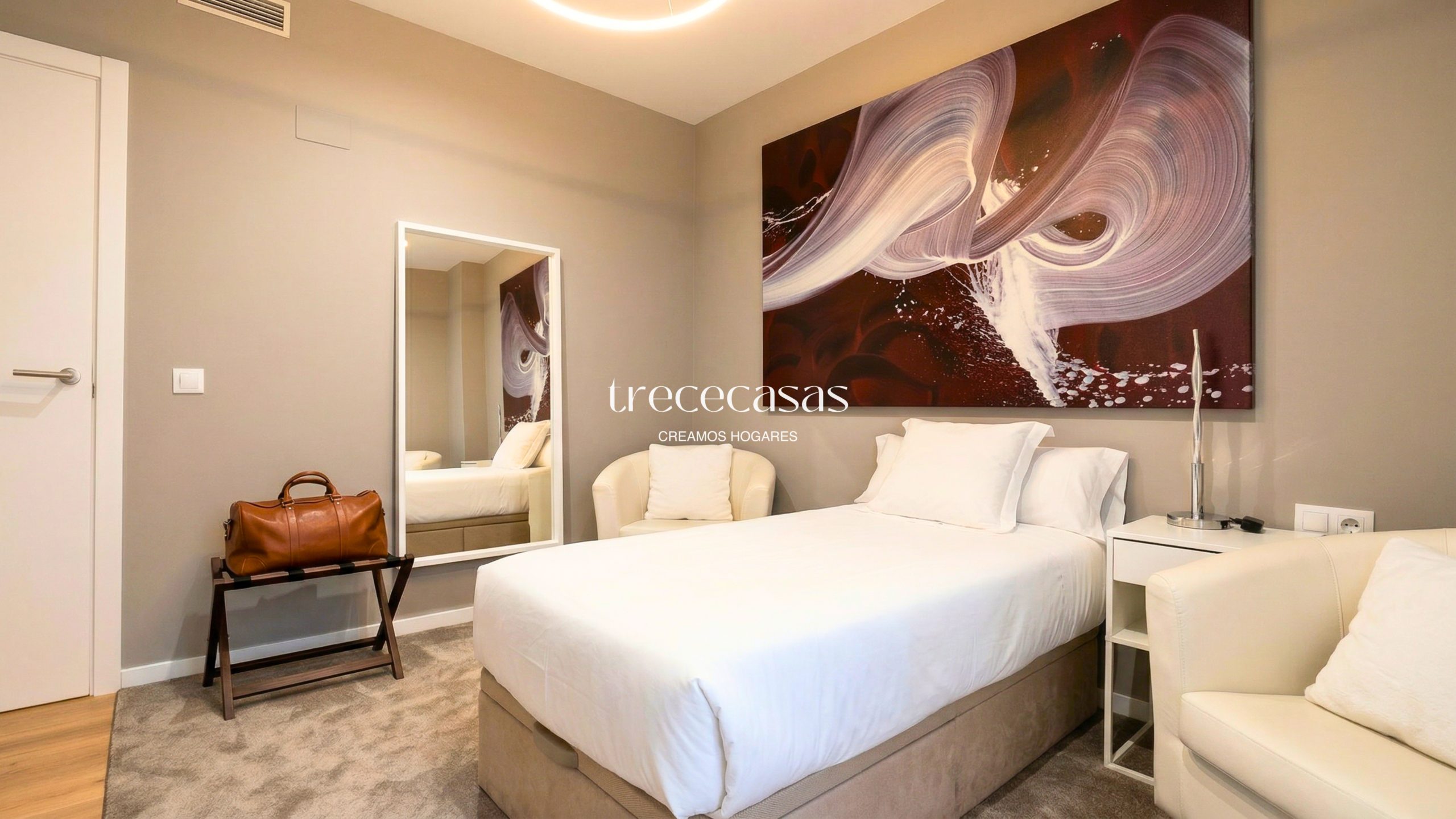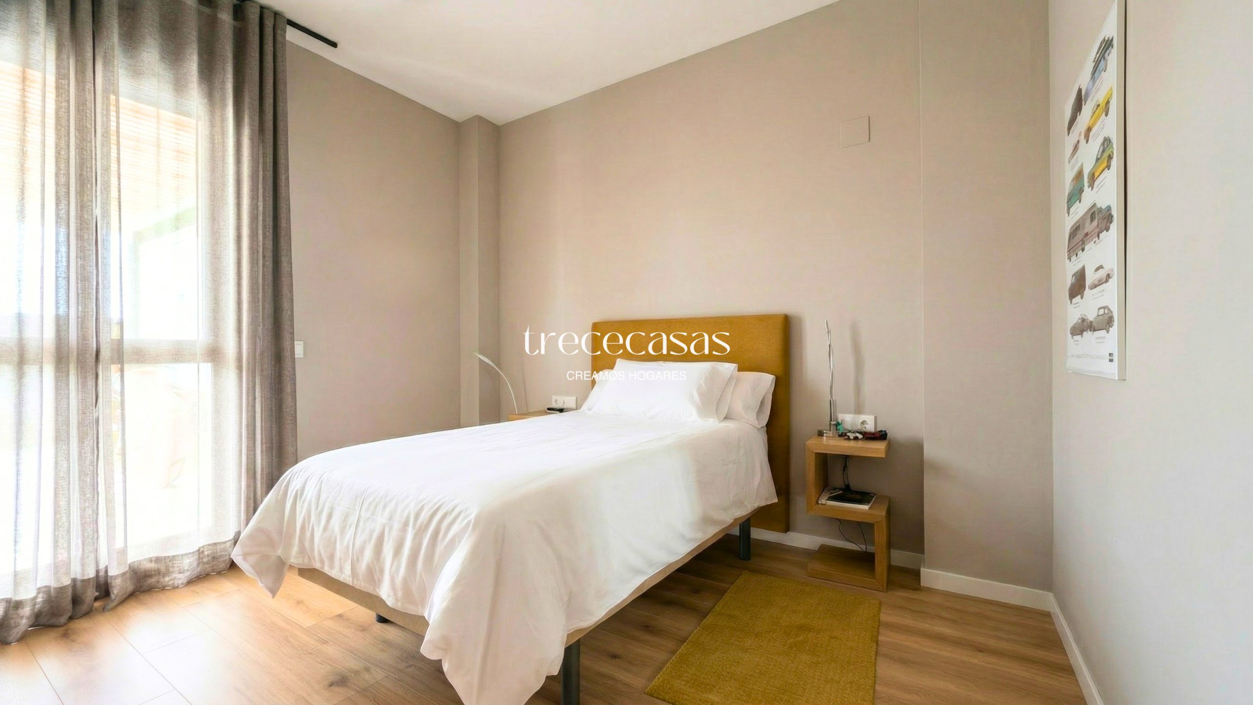 Los dormitorios cuentan con armarios empotrados, lo que facilita el almacenamiento. Por otro lado, el salón es amplio y luminoso, con suelos de parquet que aportan continuidad visual.