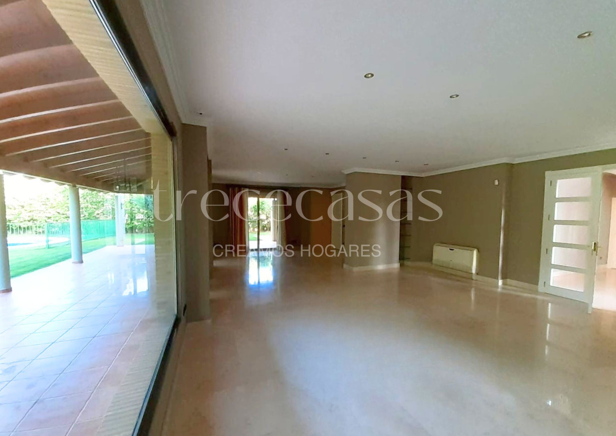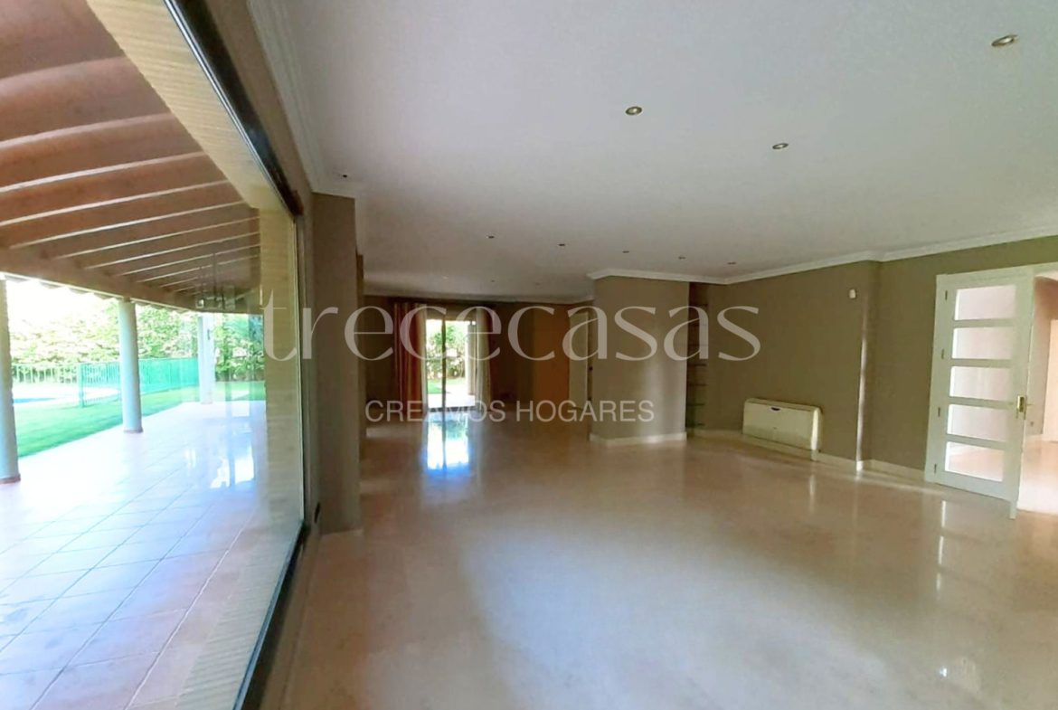 En el interior, la vivienda ofrece 517 m² construidos. La planta principal recibe con un elegante hall y un luminoso salón-comedor abierto al jardín. La cocina, amplia y equipada, incorpora salita y zona de juegos. También en este nivel se encuentra un dormitorio con baño en suite y un baño adicional.