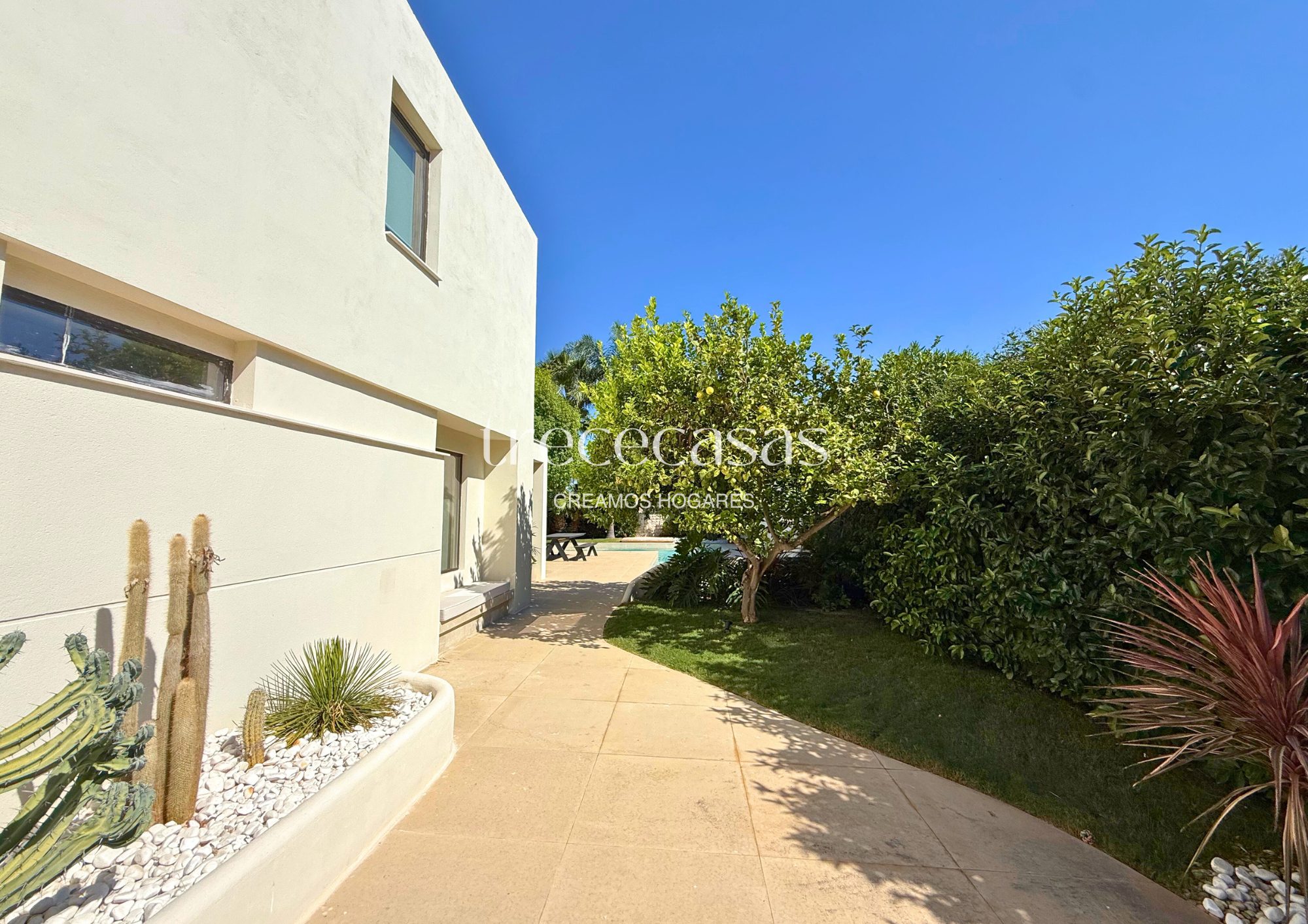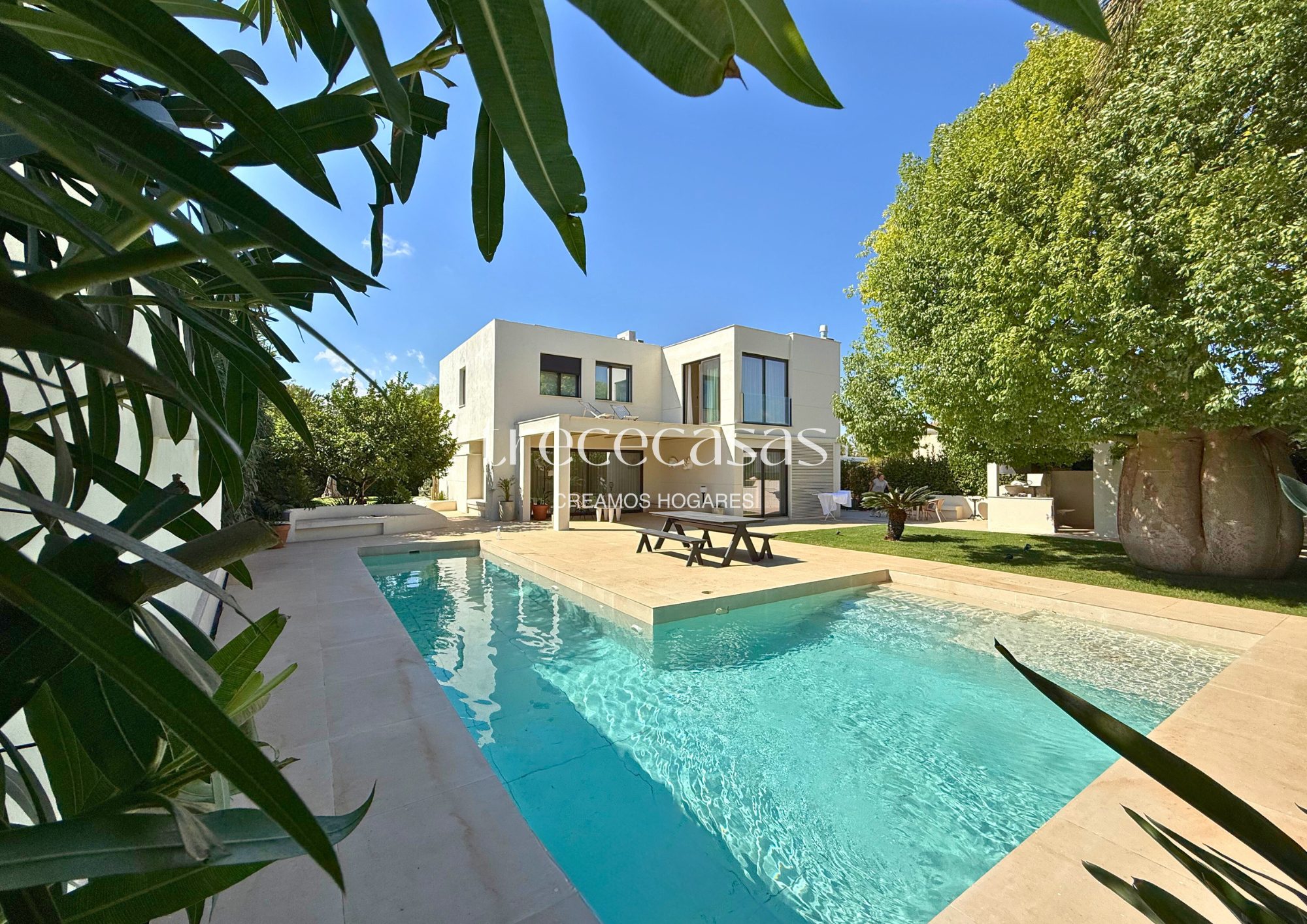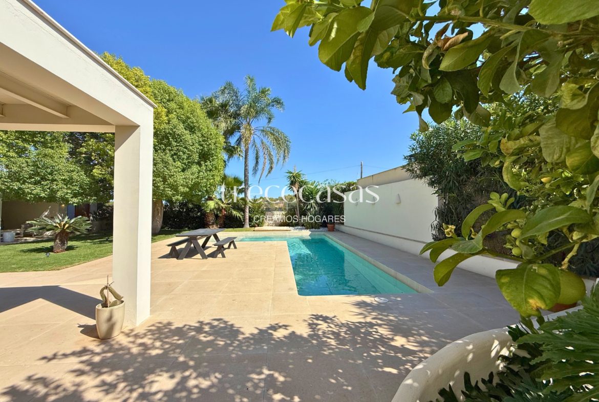 El exterior se disfruta todo el año. El jardín rodea la vivienda y crea zonas de uso diferenciadas. La piscina privada aporta frescura y un punto de calma, sin perder privacidad. La verdad es que este espacio se convierte en una extensión natural del interior, ideal para vivir sin prisas.