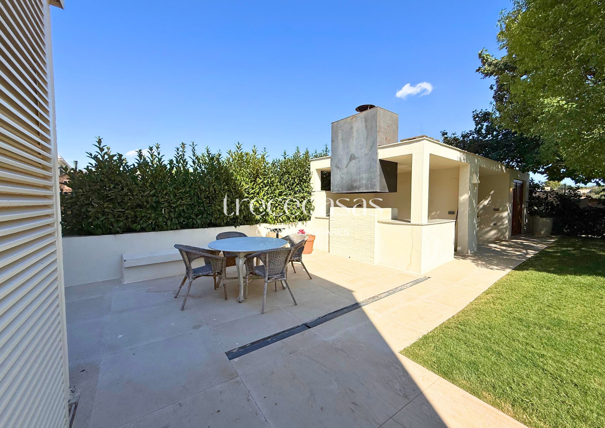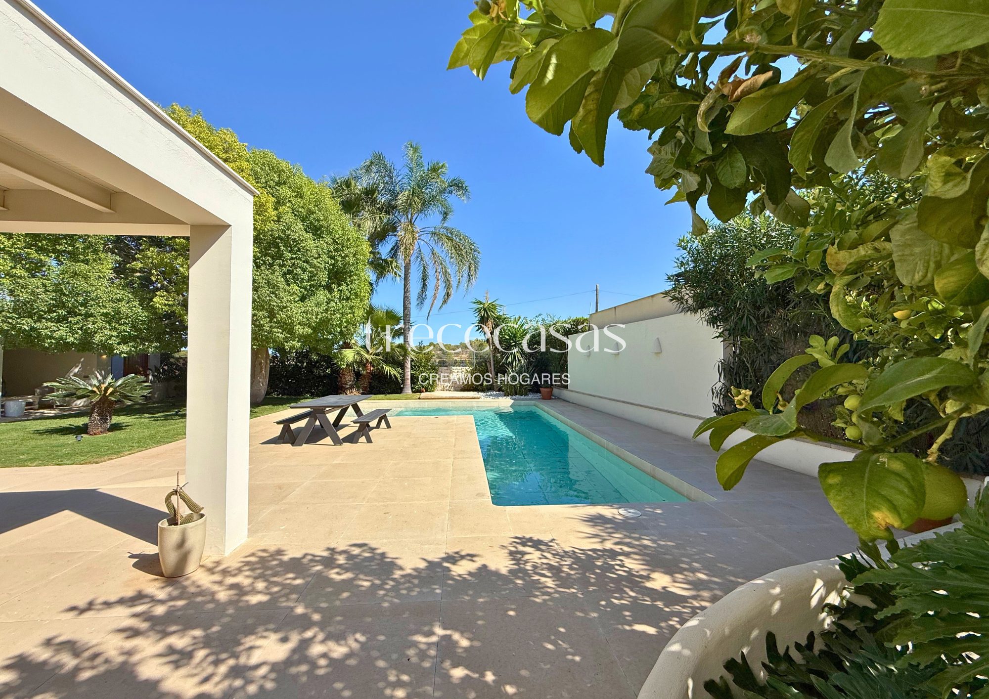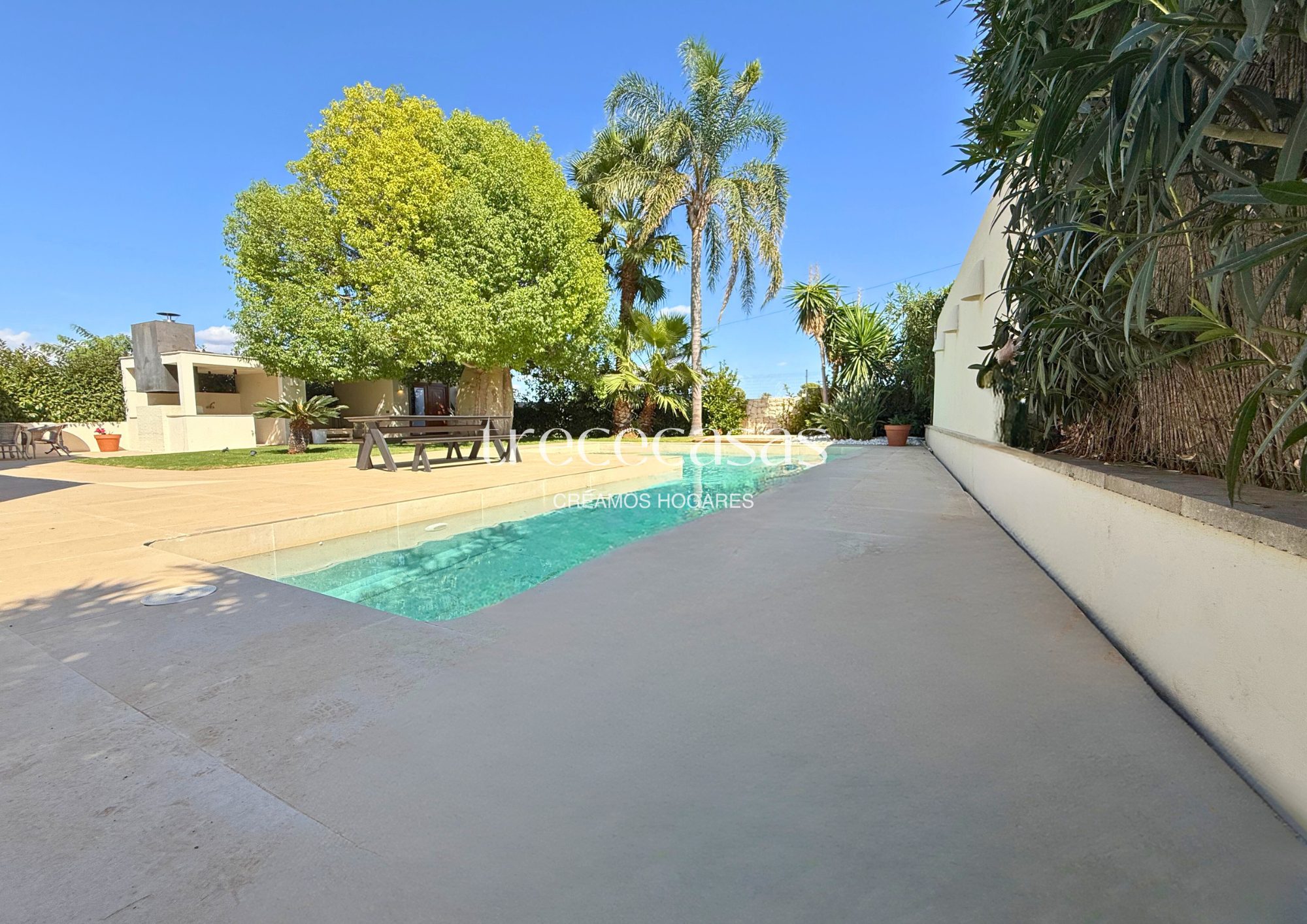 El exterior se disfruta todo el año. El jardín rodea la vivienda y crea zonas de uso diferenciadas. La piscina privada aporta frescura y un punto de calma, sin perder privacidad. La verdad es que este espacio se convierte en una extensión natural del interior, ideal para vivir sin prisas.