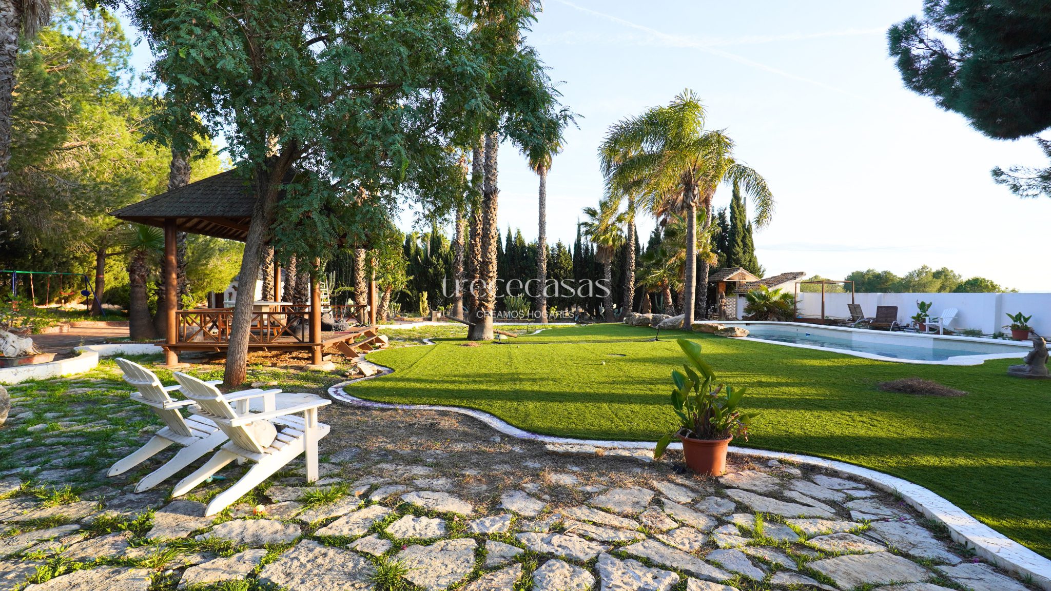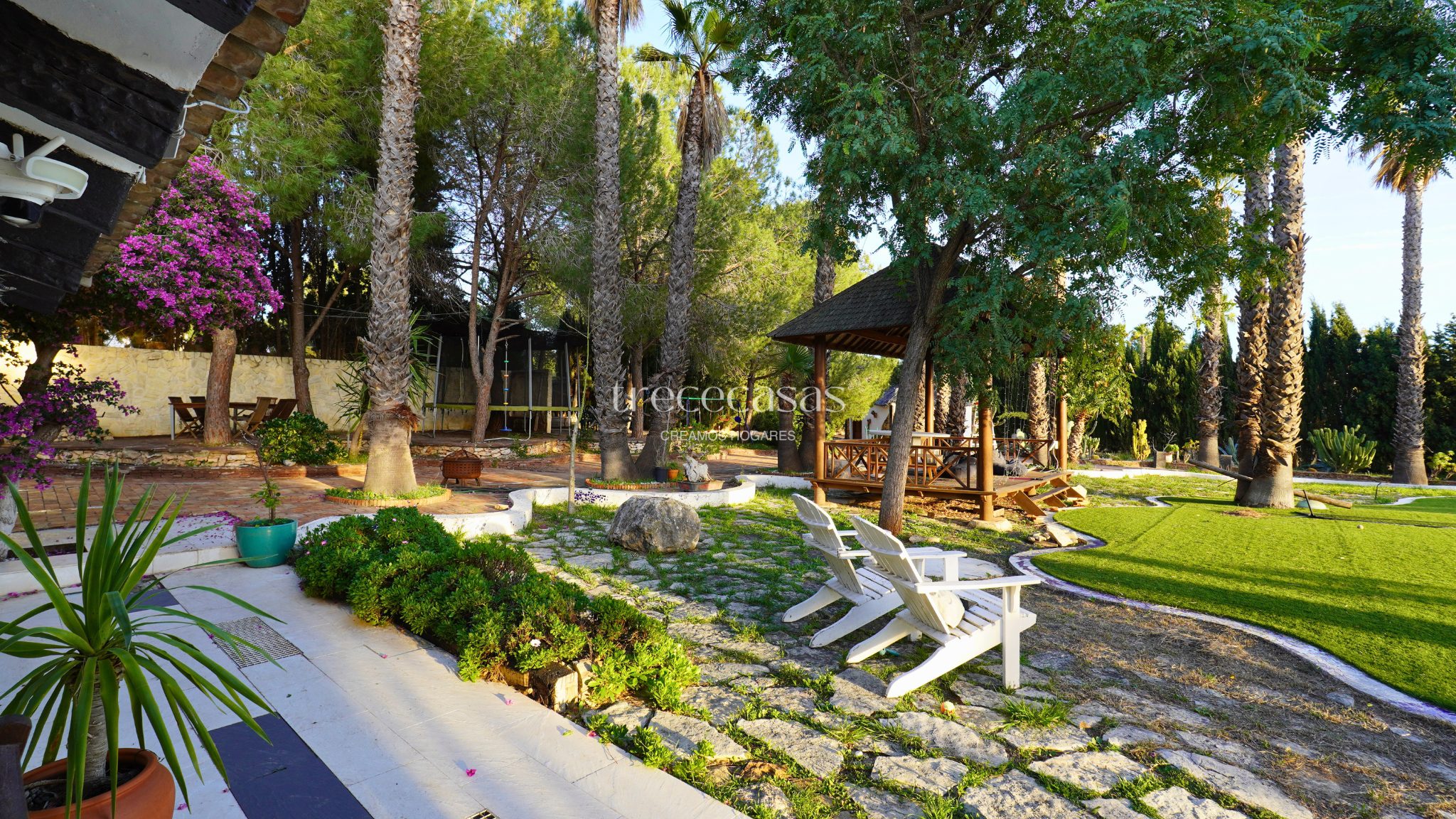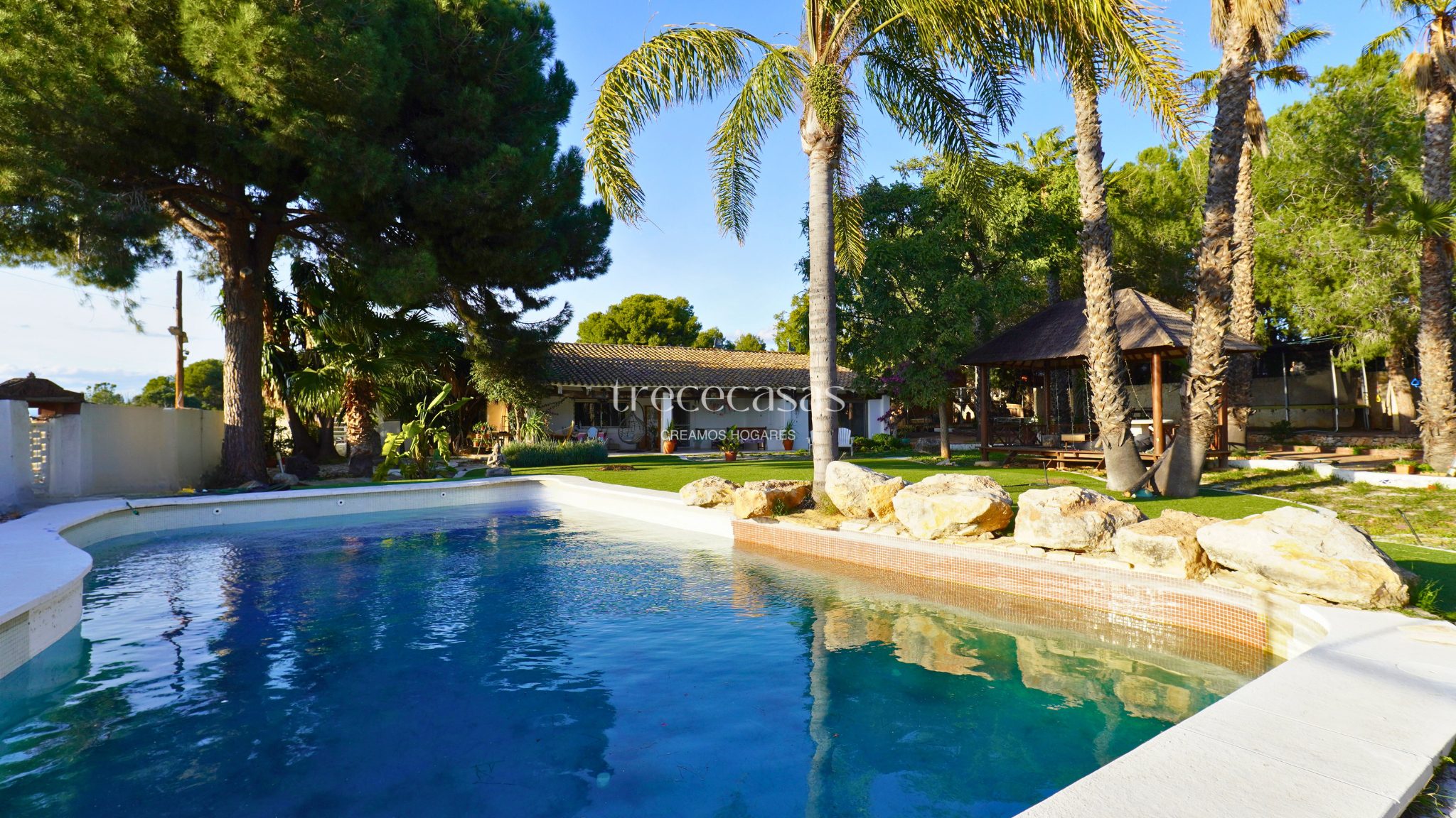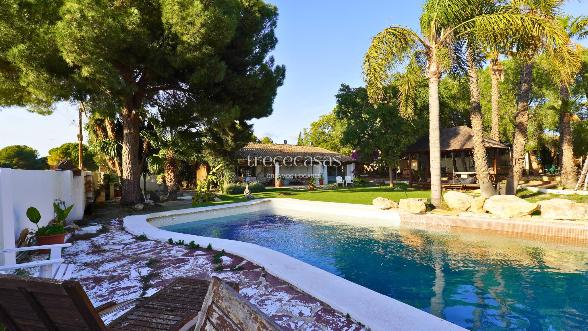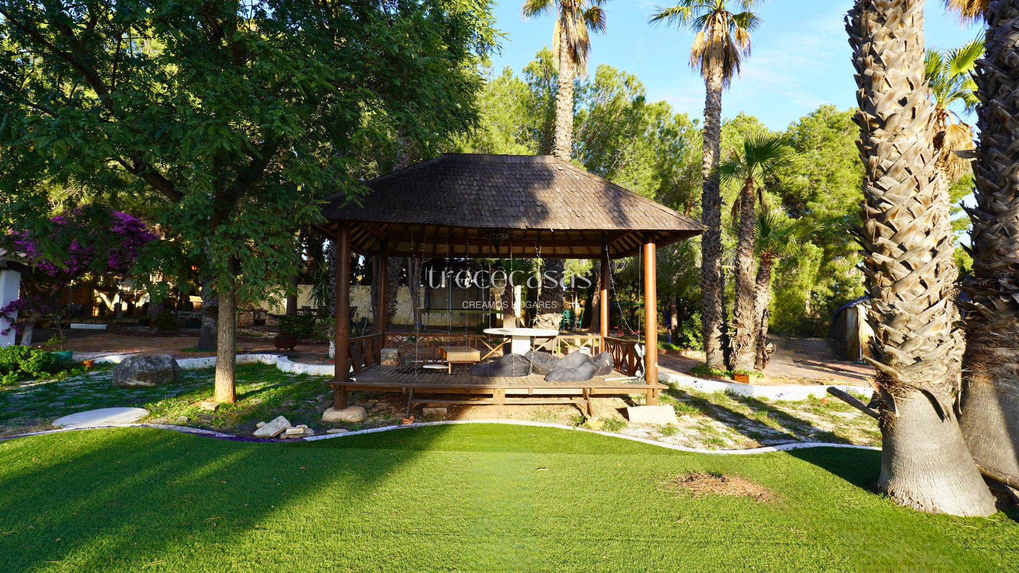 El exterior marca la diferencia. El jardín combina especies mediterráneas y tropicales, creando un entorno verde, íntimo y bien estructurado. La piscina de diseño se integra de forma natural con una zona chill out de inspiración balinesa y un cenador de madera, pensados para disfrutar sin prisas. Además, el paellero tradicional, situado bajo pinos centenarios, permite reuniones largas al aire libre. Por otro lado, una construcción independiente amplía las posibilidades de uso como estudio, despacho o vivienda de invitados.
