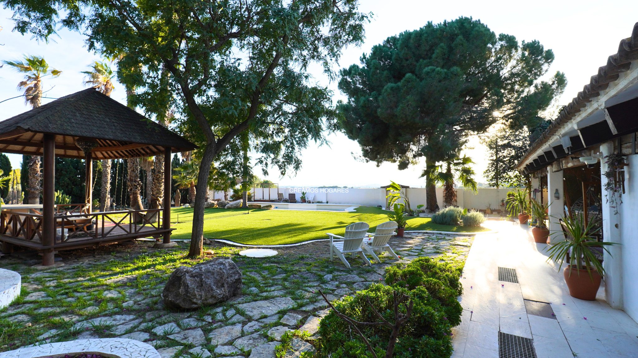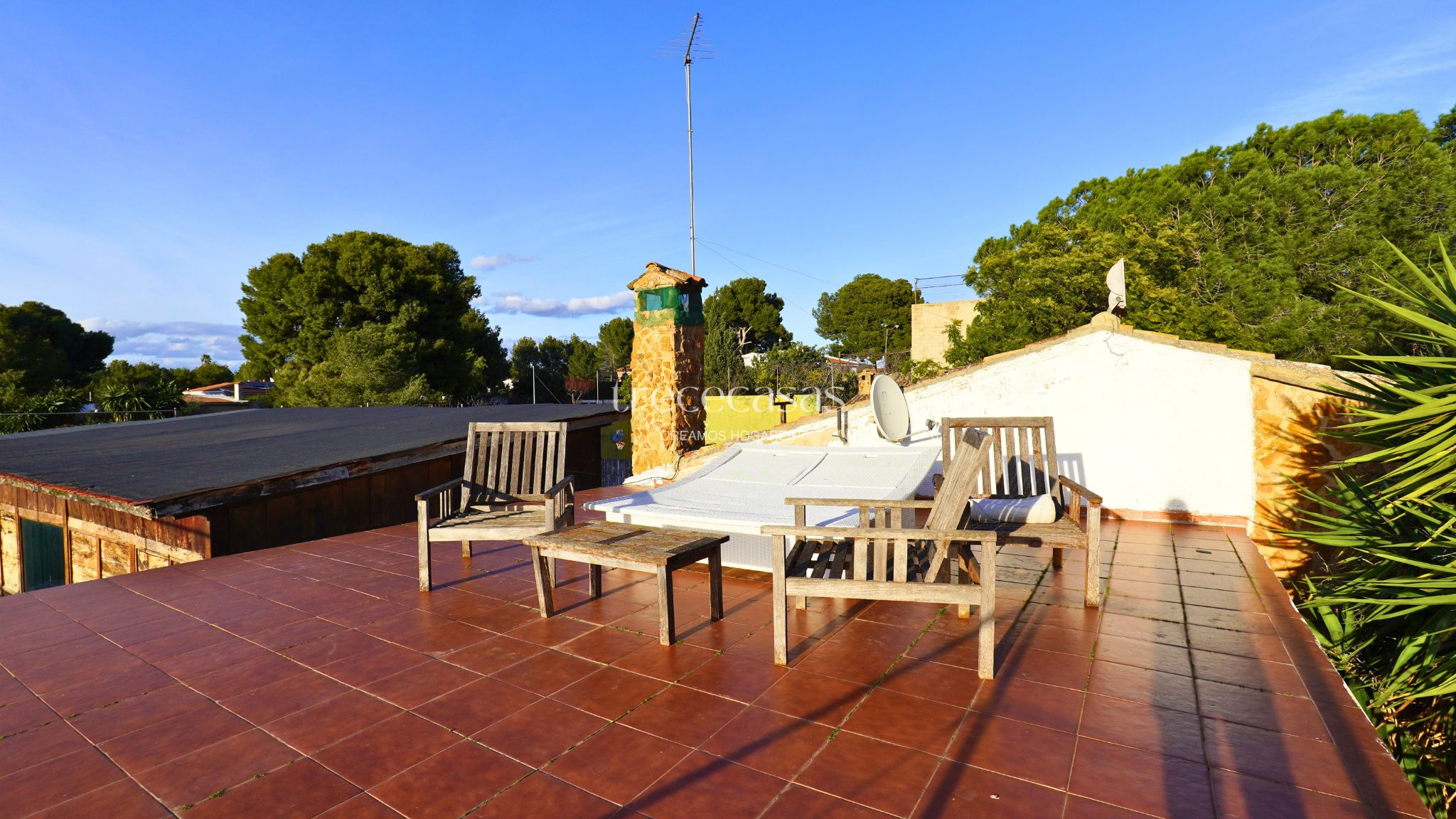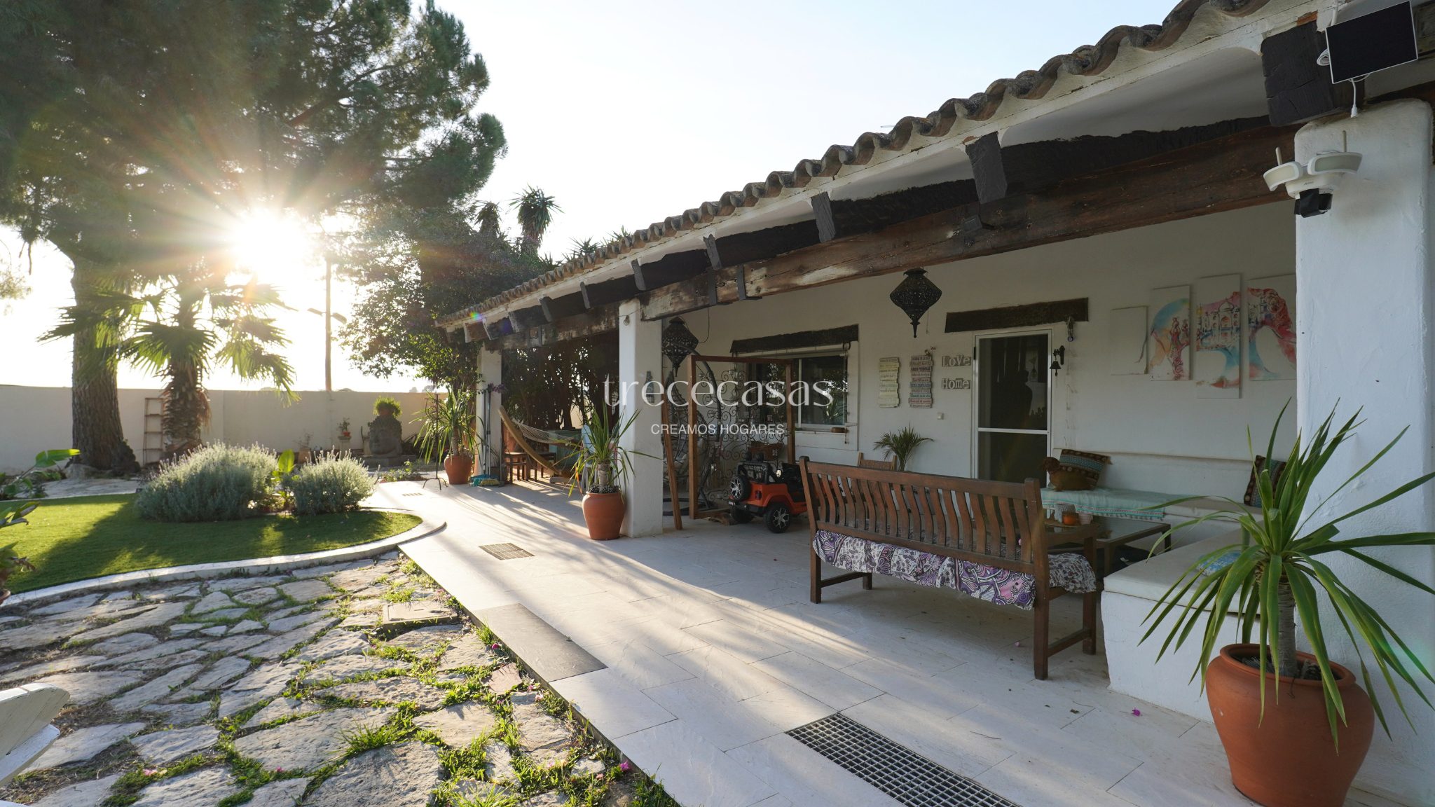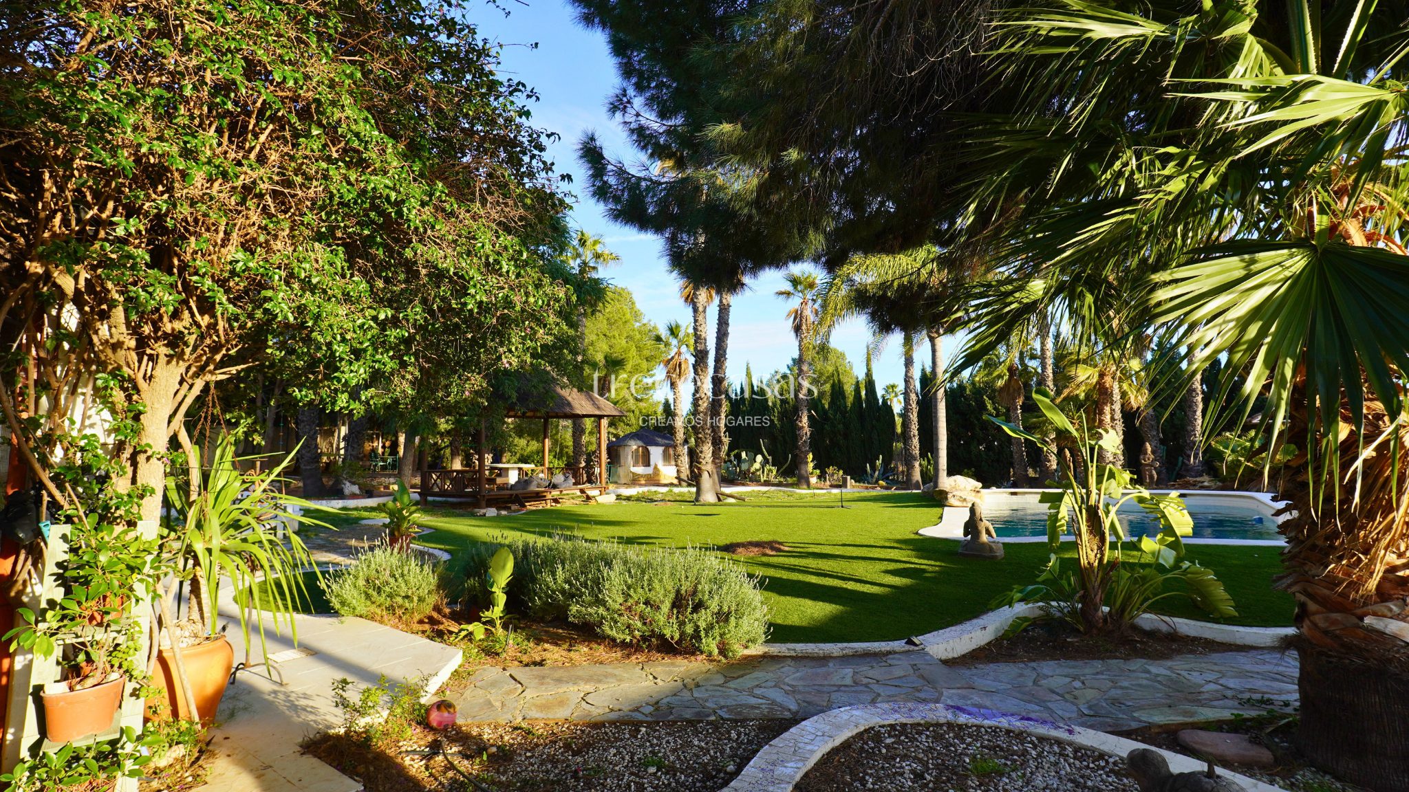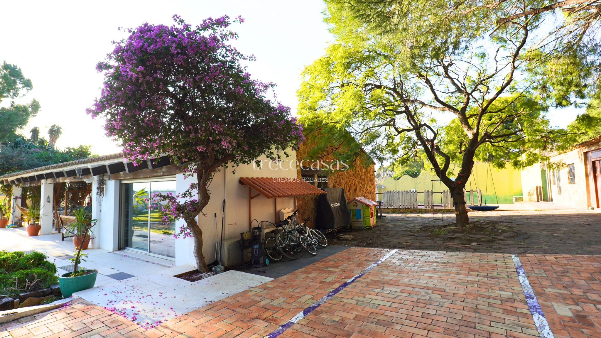 El exterior marca la diferencia. El jardín combina especies mediterráneas y tropicales, creando un entorno verde, íntimo y bien estructurado. La piscina de diseño se integra de forma natural con una zona chill out de inspiración balinesa y un cenador de madera, pensados para disfrutar sin prisas. Además, el paellero tradicional, situado bajo pinos centenarios, permite reuniones largas al aire libre. Por otro lado, una construcción independiente amplía las posibilidades de uso como estudio, despacho o vivienda de invitados.