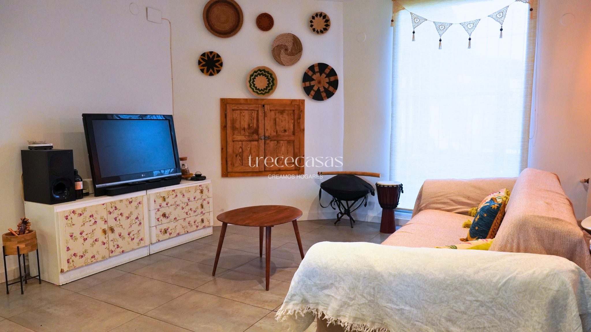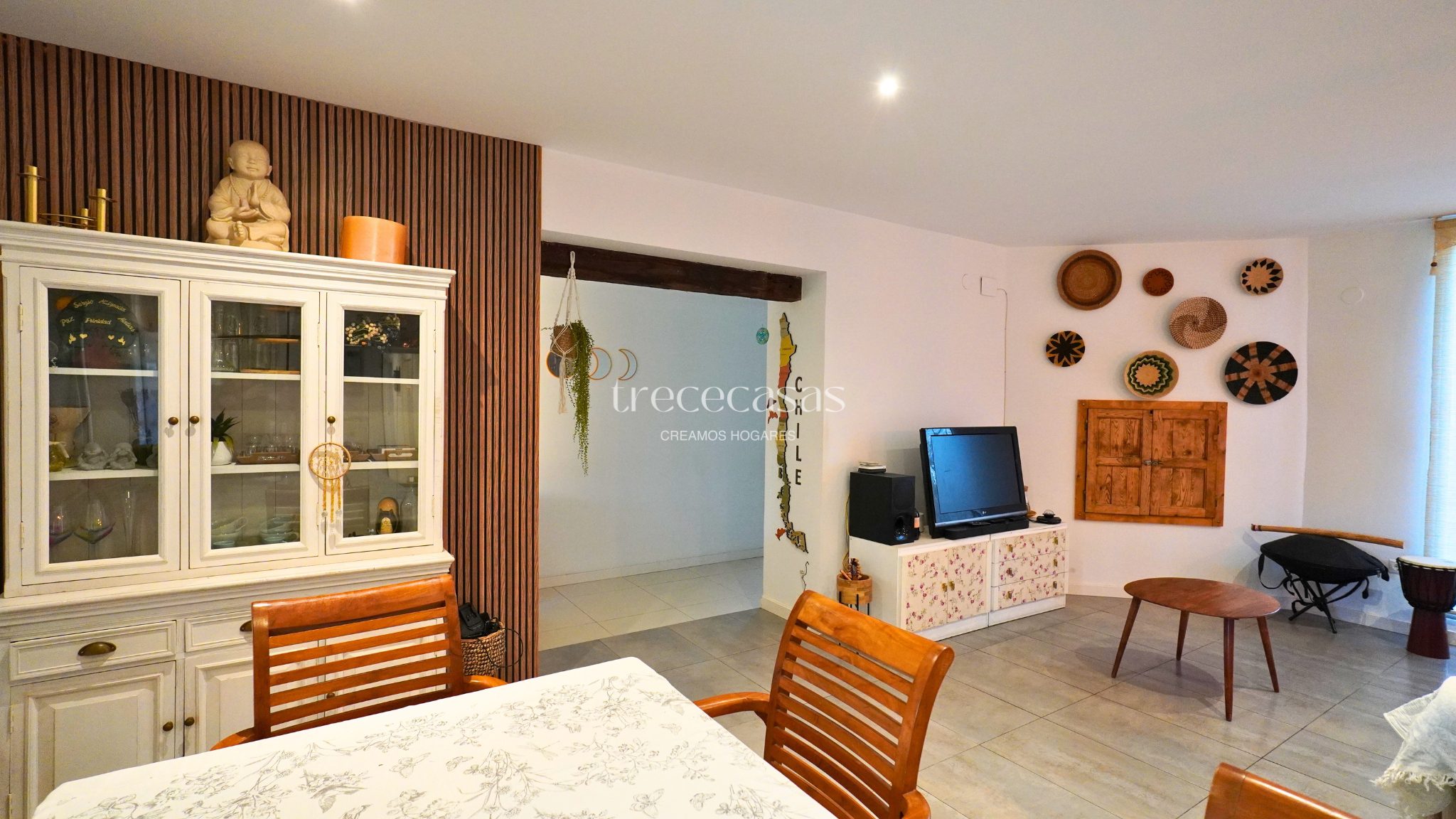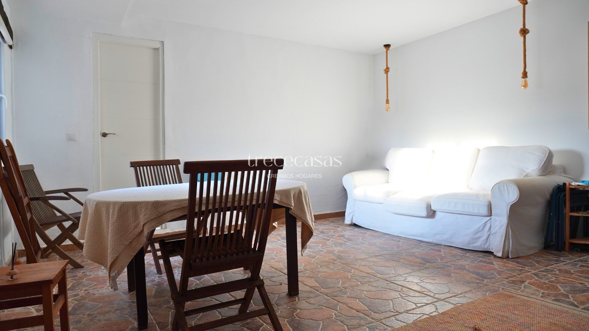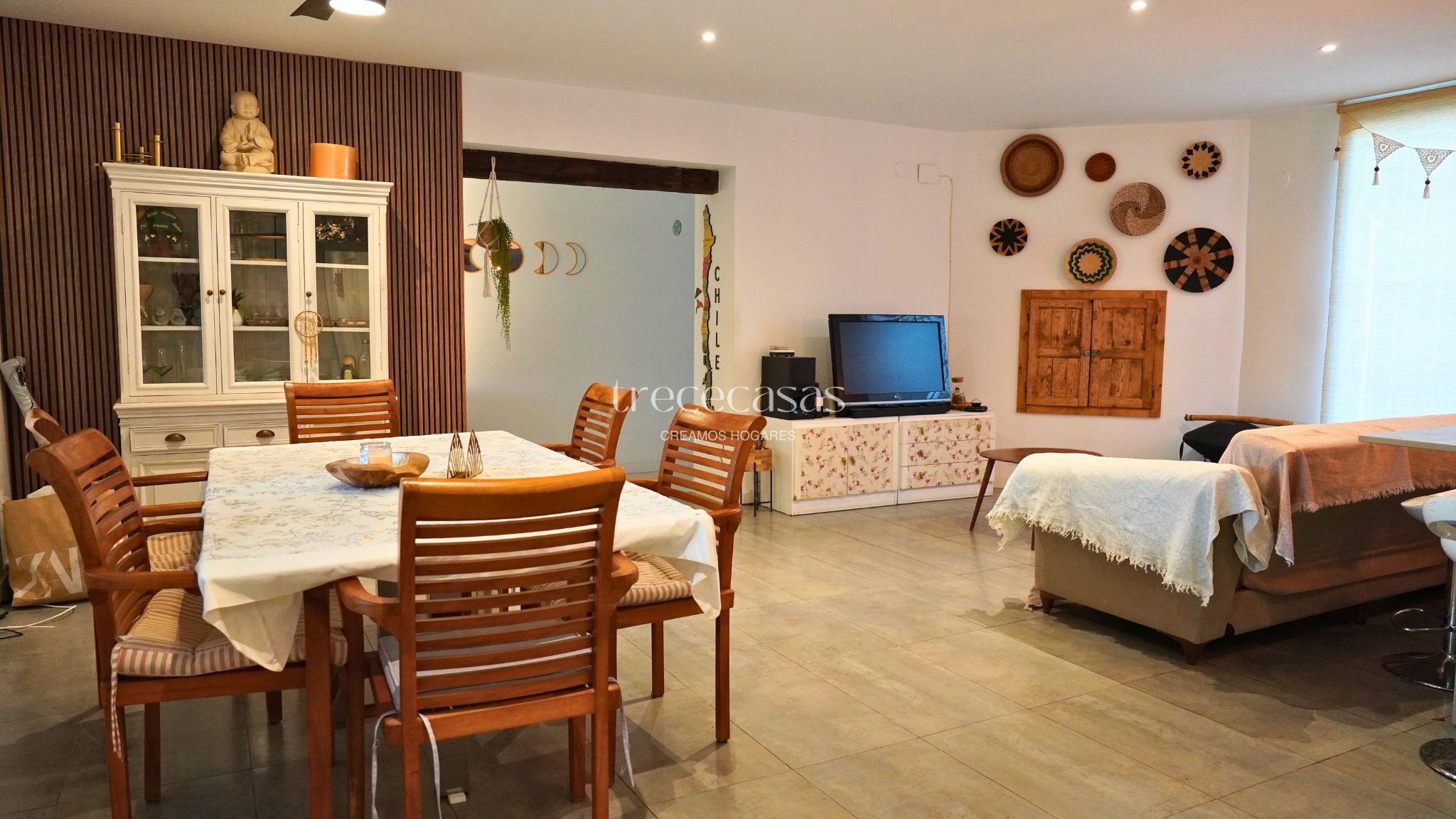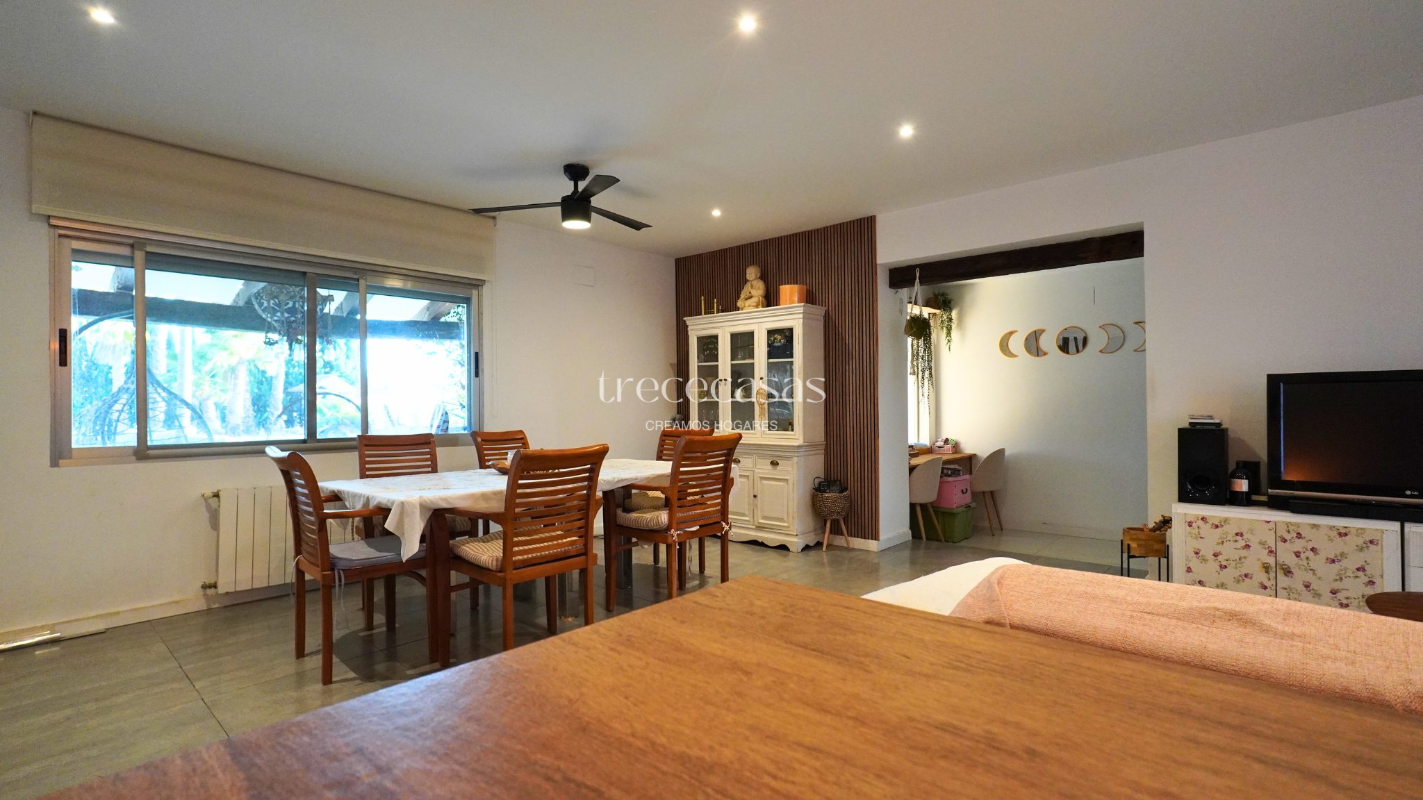 La vivienda principal destaca por su luminosidad y coherencia estética. El salón comedor es amplio, con techos altos y vigas de madera vista que aportan carácter sin recargar el espacio. Grandes ventanales conectan el interior con el jardín y permiten la entrada constante de luz natural durante todo el día. Sin embargo, el ambiente se mantiene sereno y acogedor.