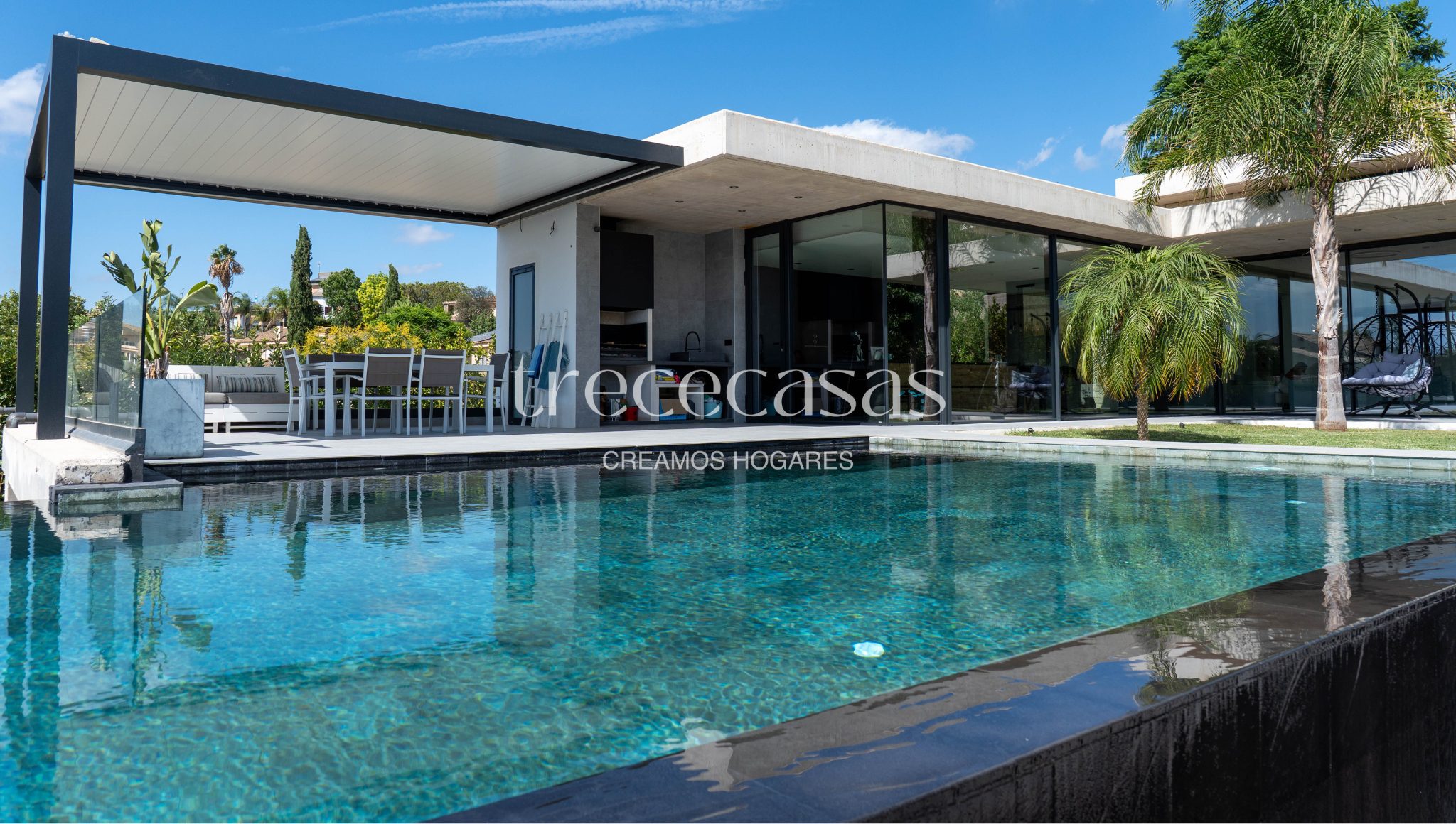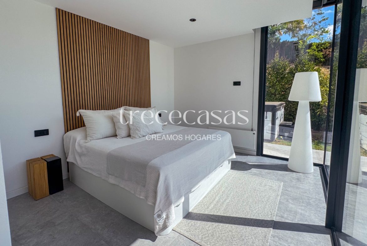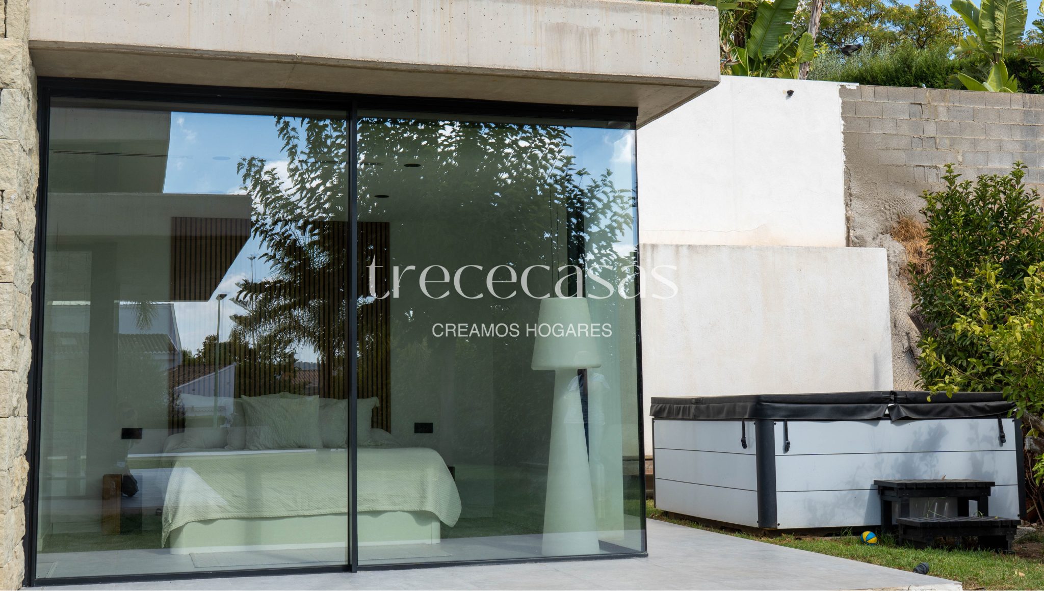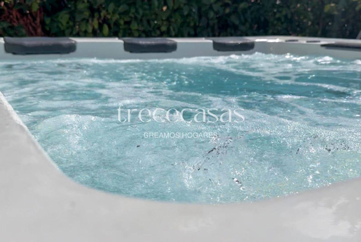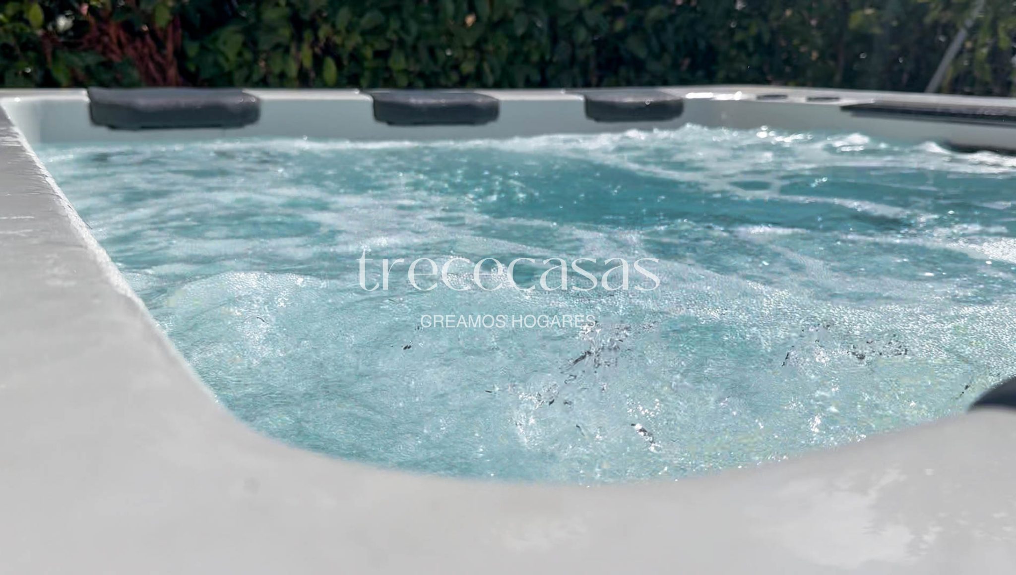 En el exterior, la protagonista es la piscina desbordante climatizada, rodeada de terraza y jardín. Su diseño crea la sensación de continuidad con el paisaje, aportando calma y elegancia. Además, el chalet cuenta con jacuzzi, perfecto para relajarse en cualquier época del año.