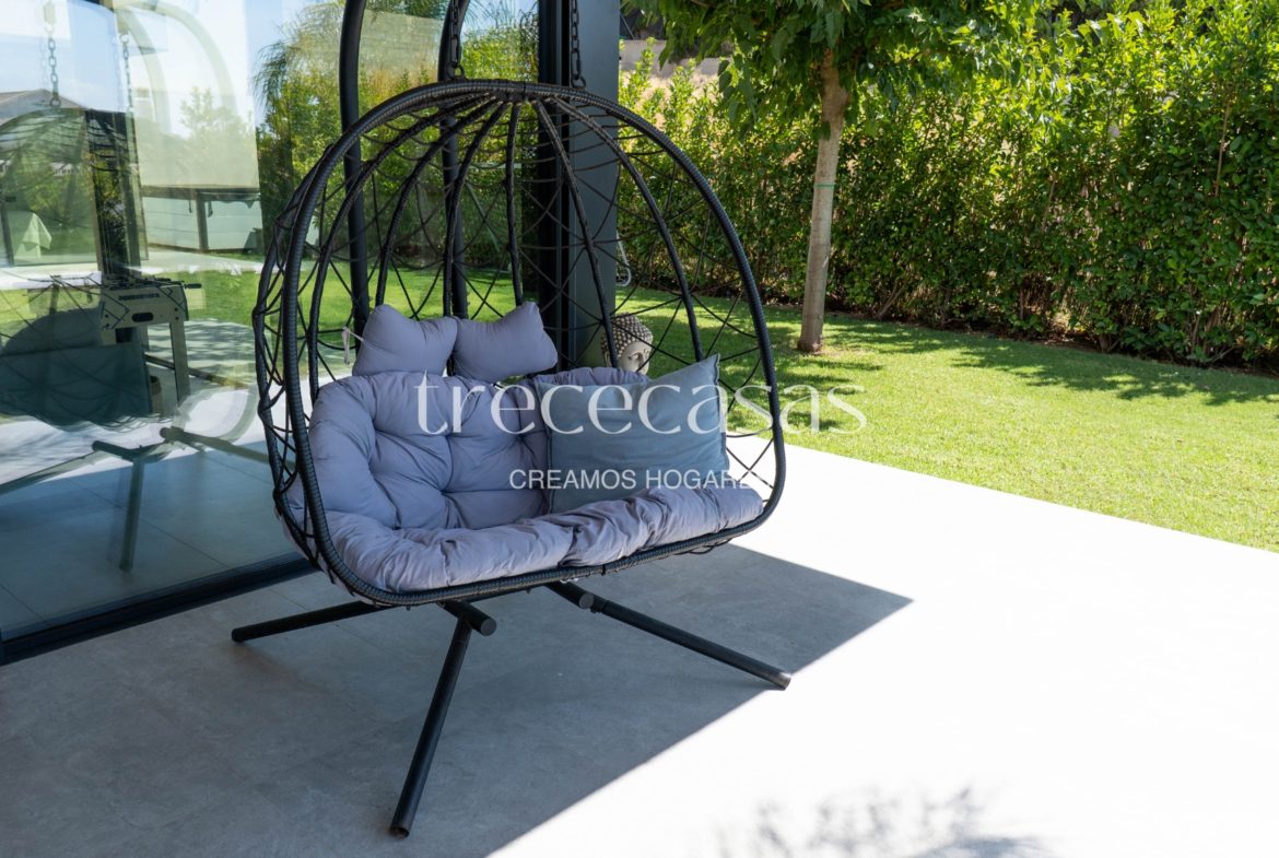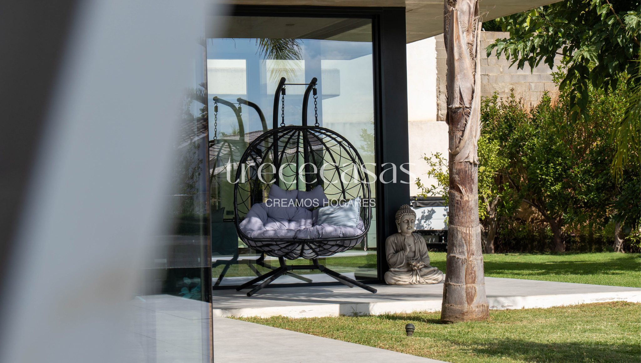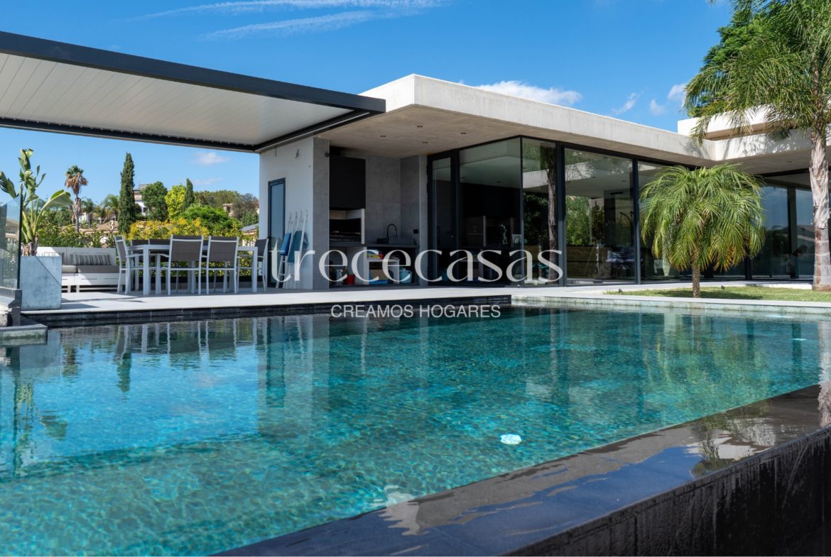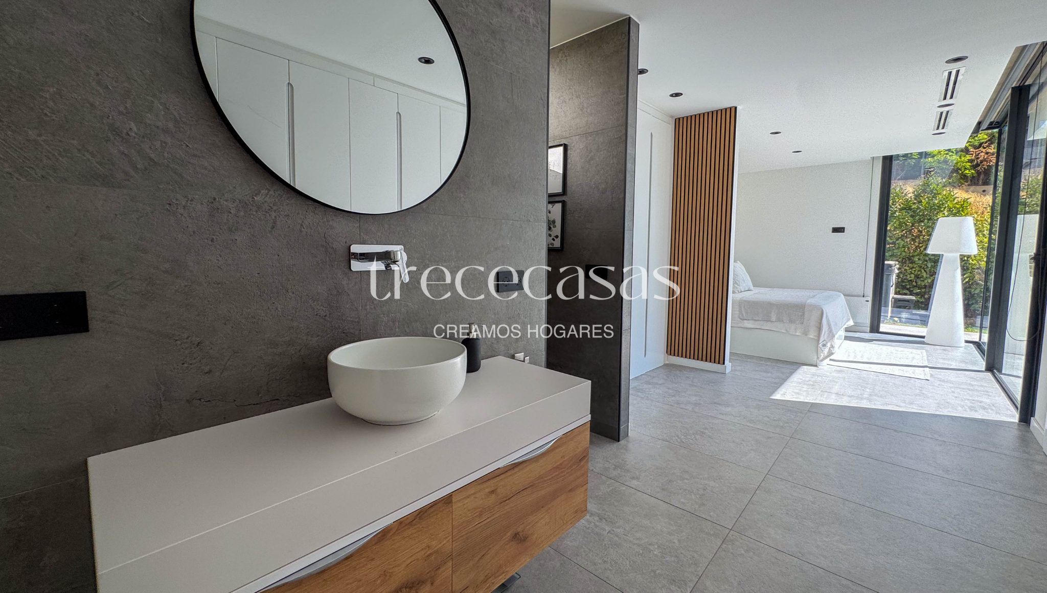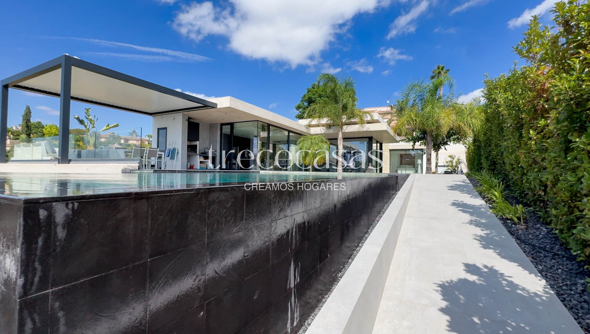 En el exterior, la protagonista es la piscina desbordante climatizada, rodeada de terraza y jardín. Su diseño crea la sensación de continuidad con el paisaje, aportando calma y elegancia. Además, el chalet cuenta con jacuzzi, perfecto para relajarse en cualquier época del año.