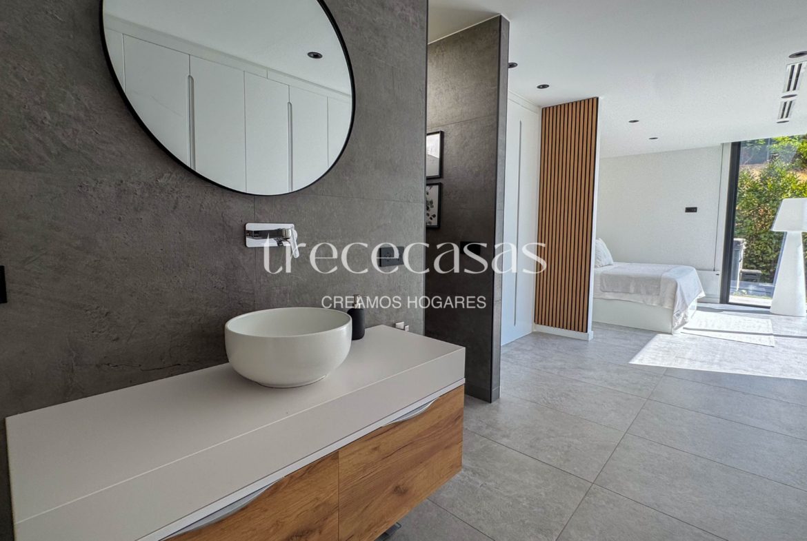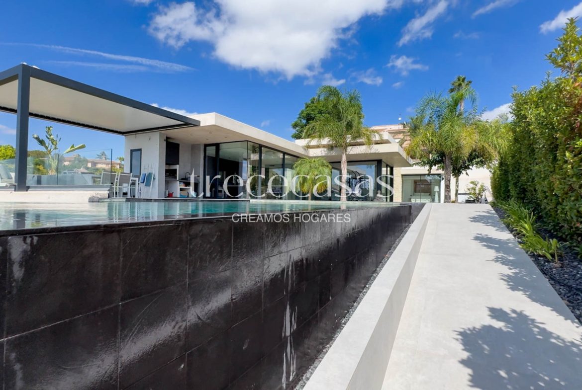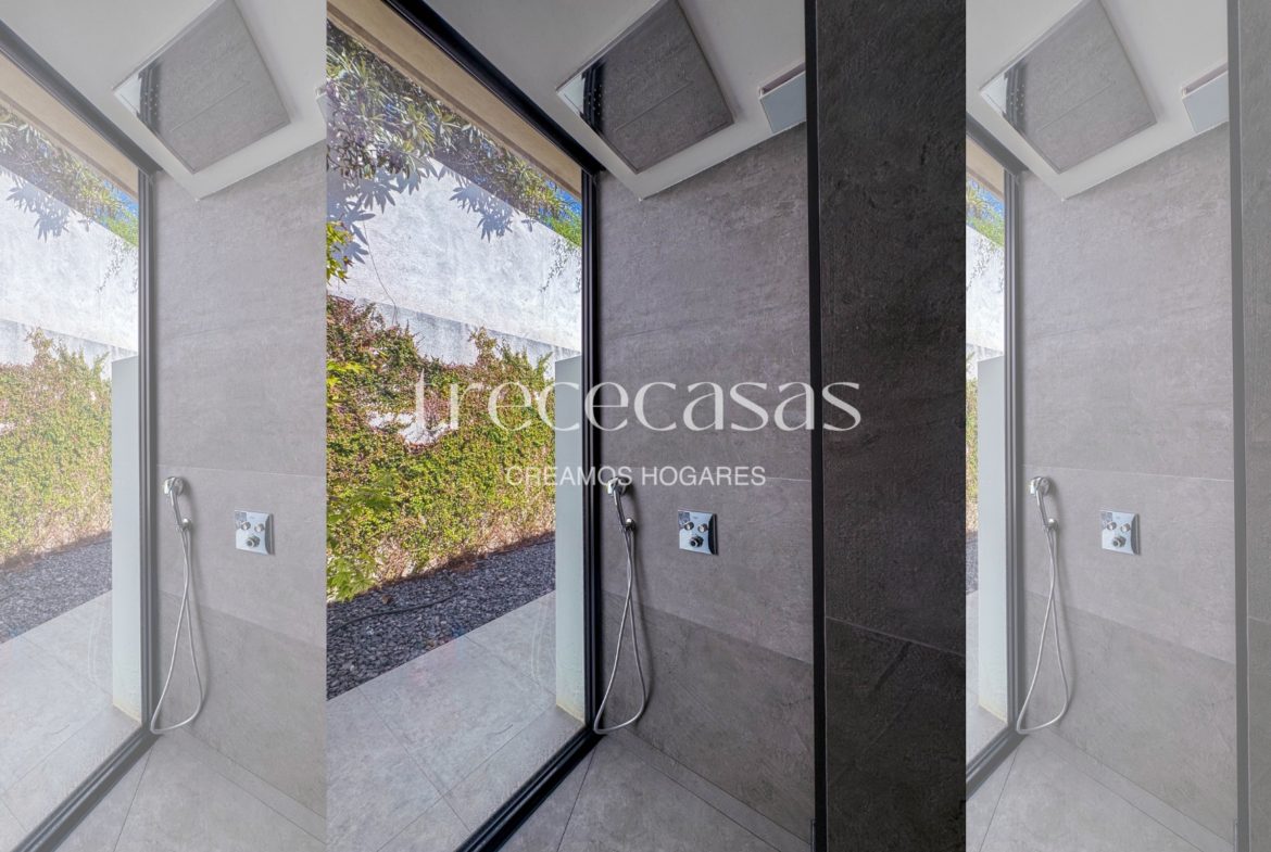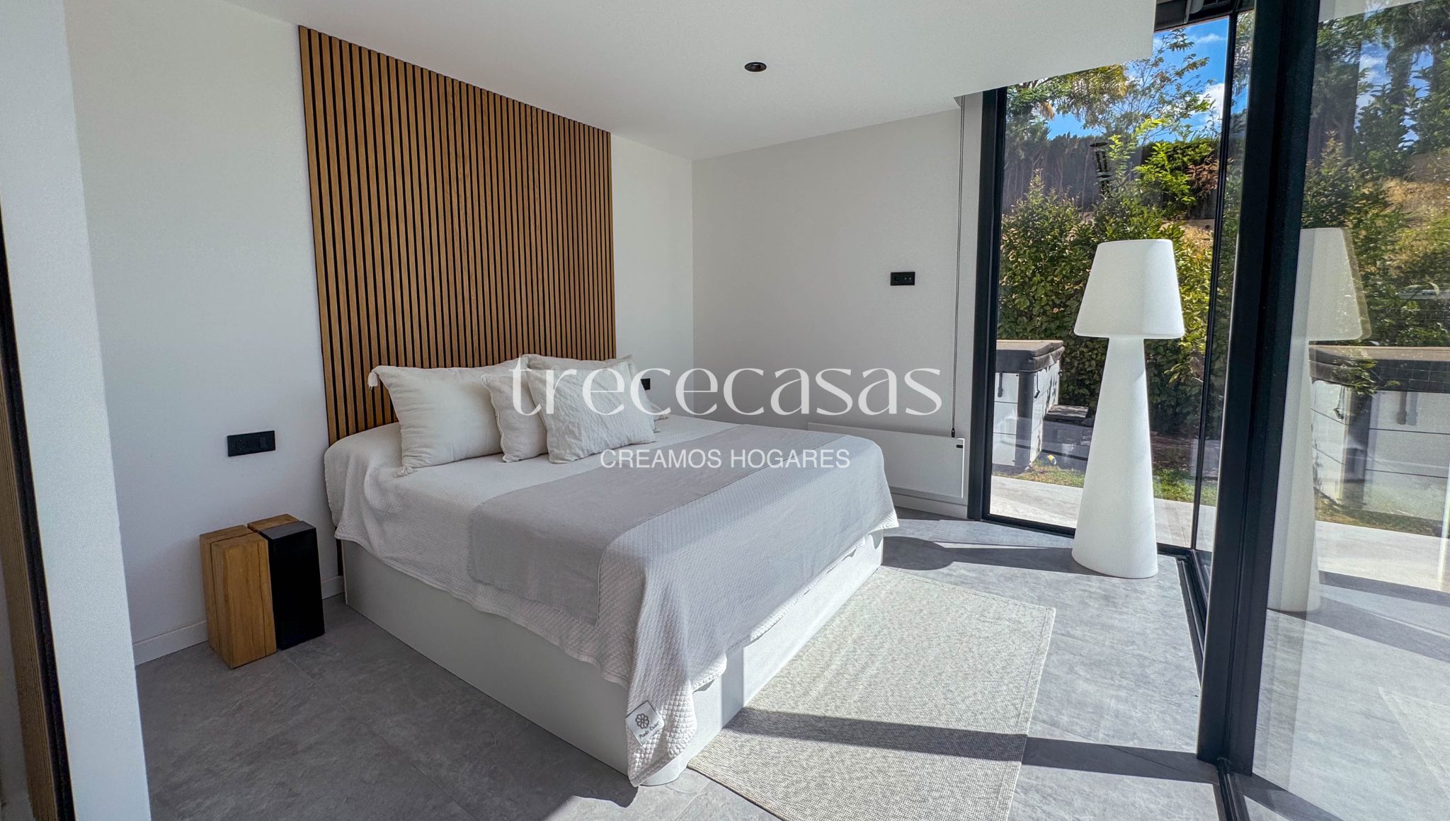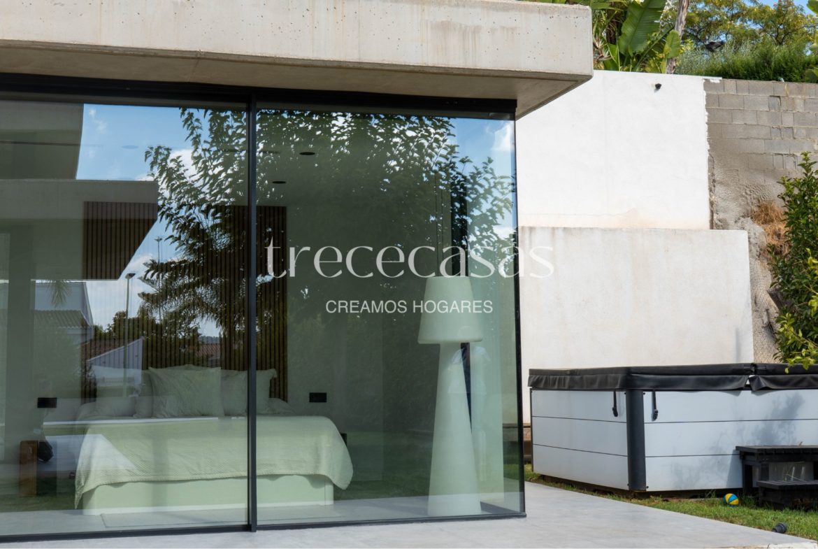 En el exterior, la protagonista es la piscina desbordante climatizada, rodeada de terraza y jardín. Su diseño crea la sensación de continuidad con el paisaje, aportando calma y elegancia. Además, el chalet cuenta con jacuzzi, perfecto para relajarse en cualquier época del año.