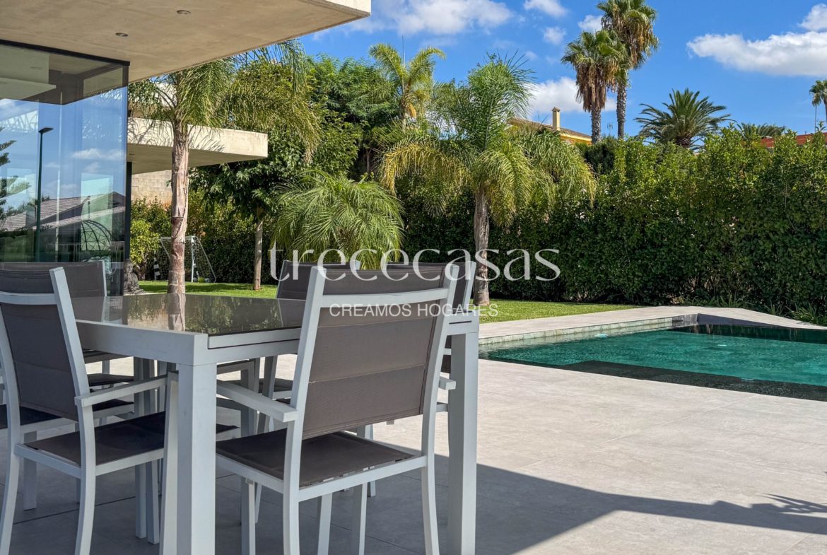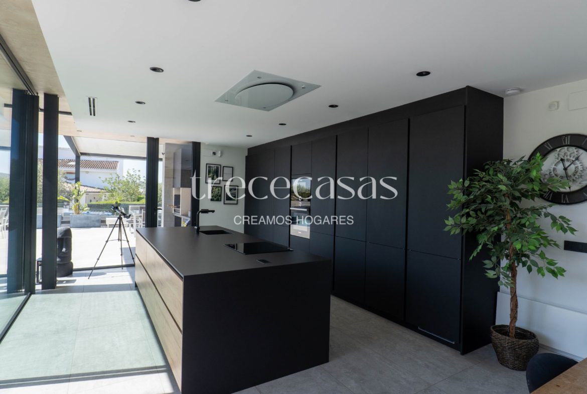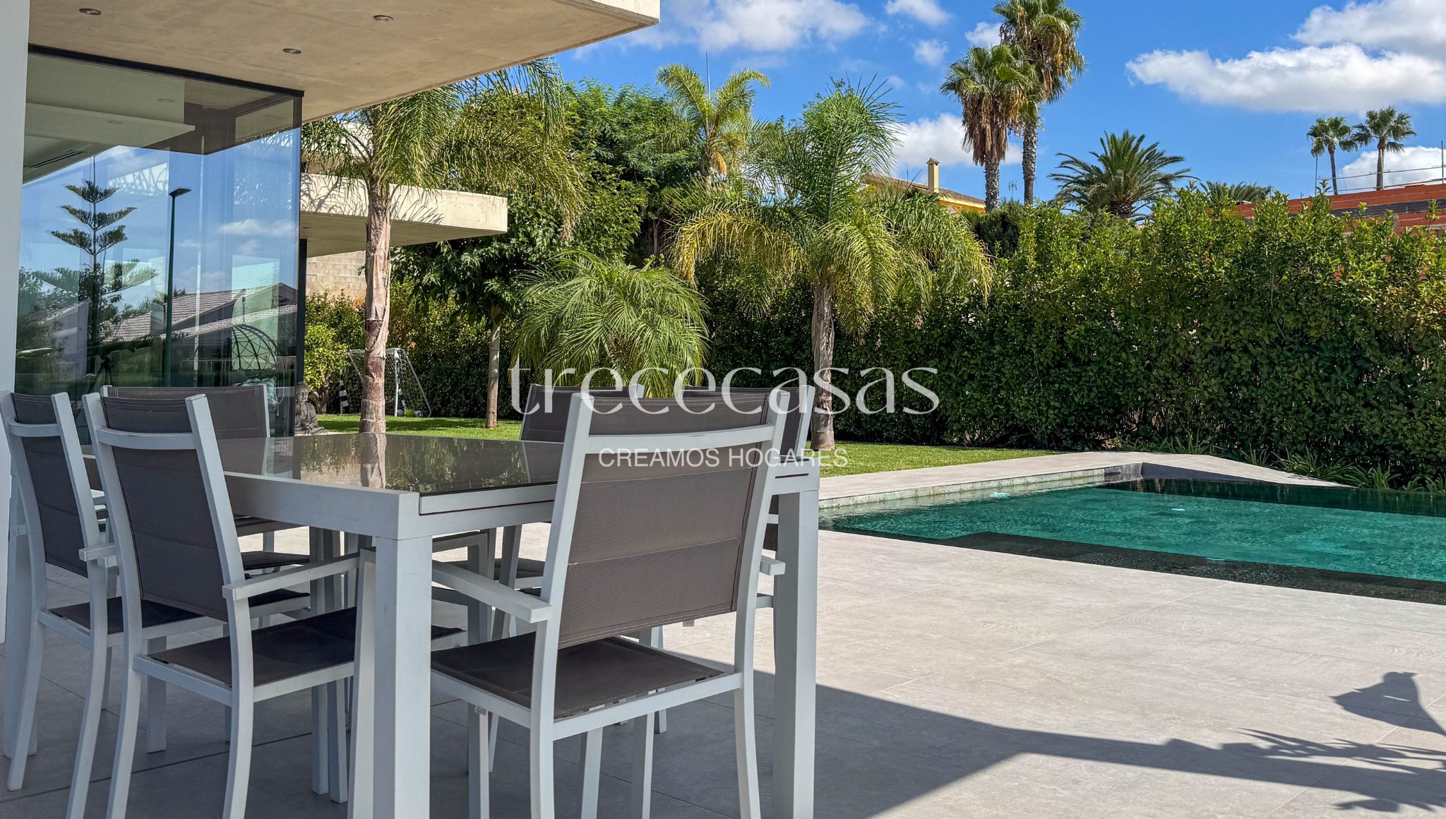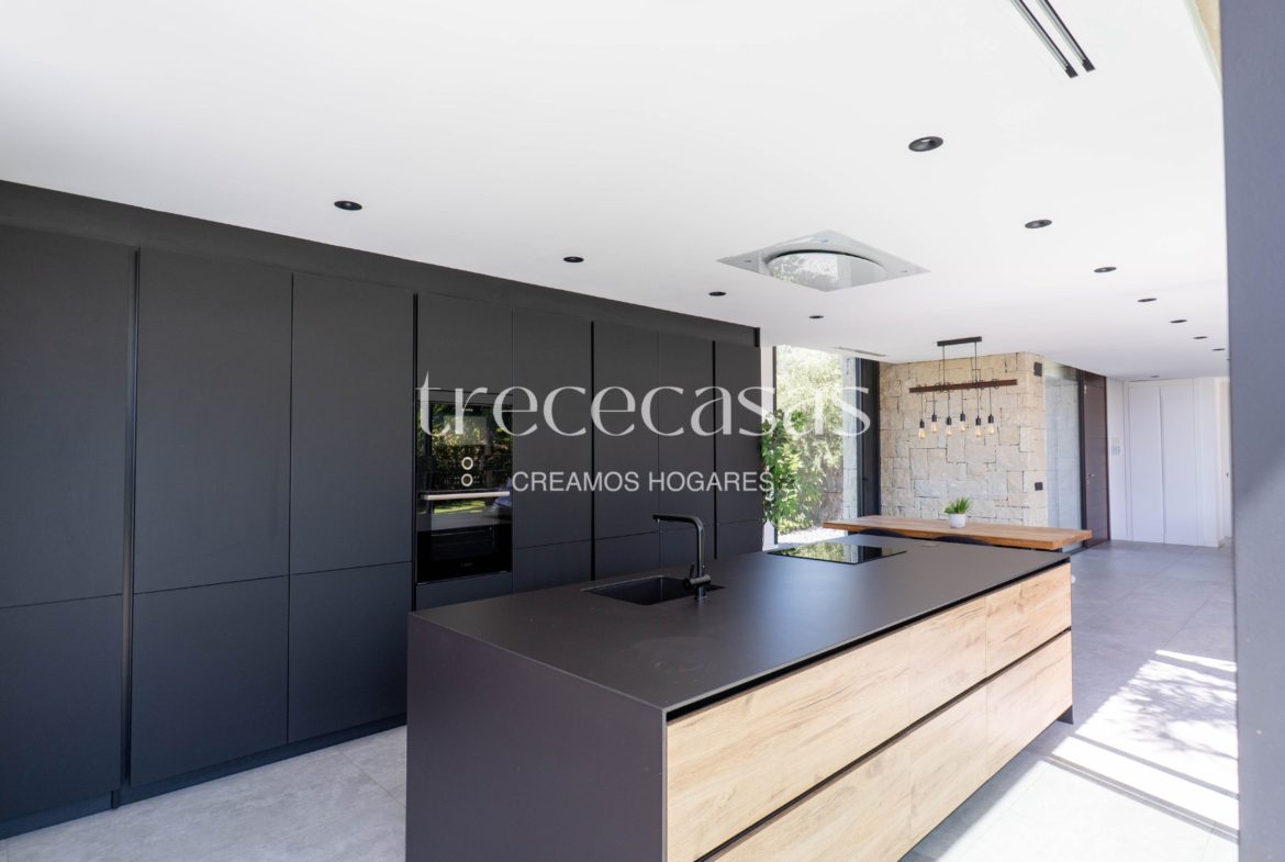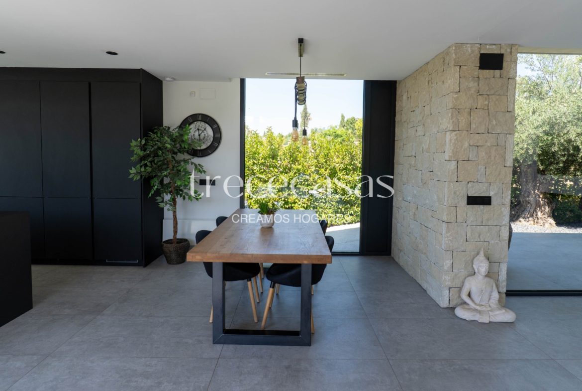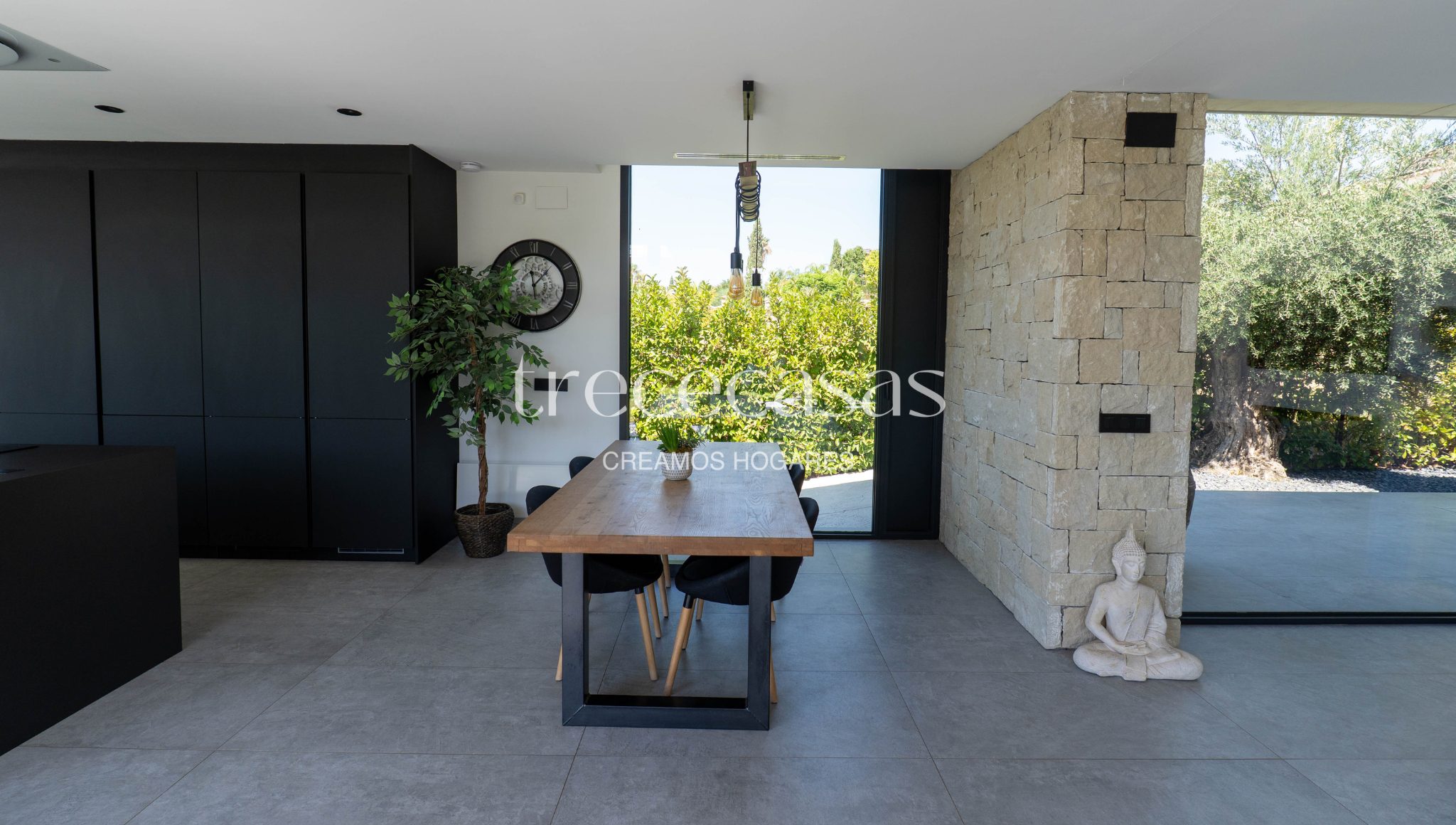 La zona de día se organiza en torno a un salón-comedor de concepto abierto, amplio y elegante, que se comunica con una cocina moderna totalmente equipada. Este espacio central invita a compartir momentos con familia o amigos, disfrutando siempre de las vistas al jardín y la piscina.