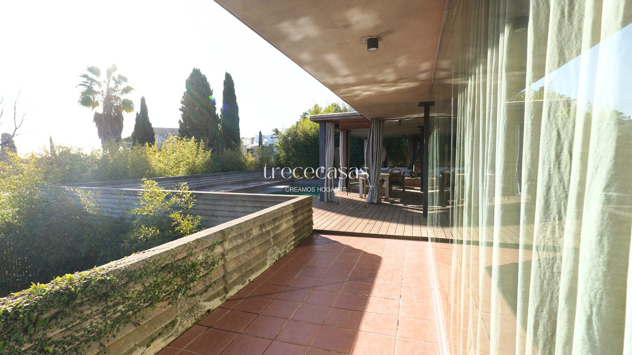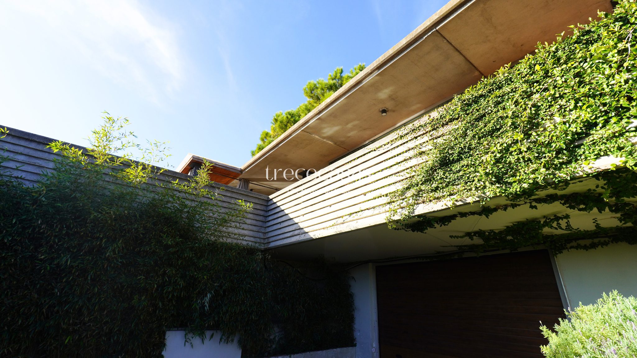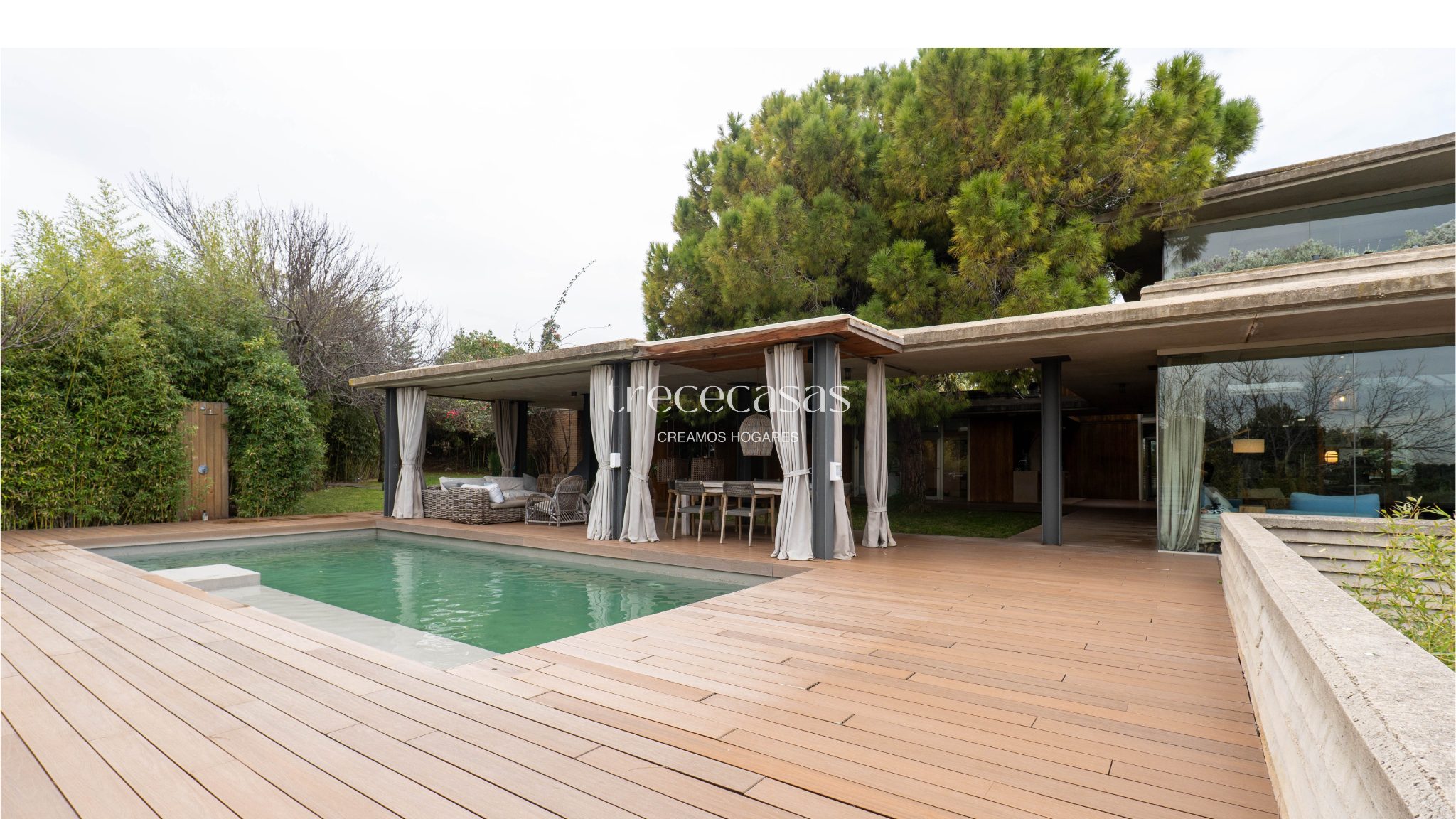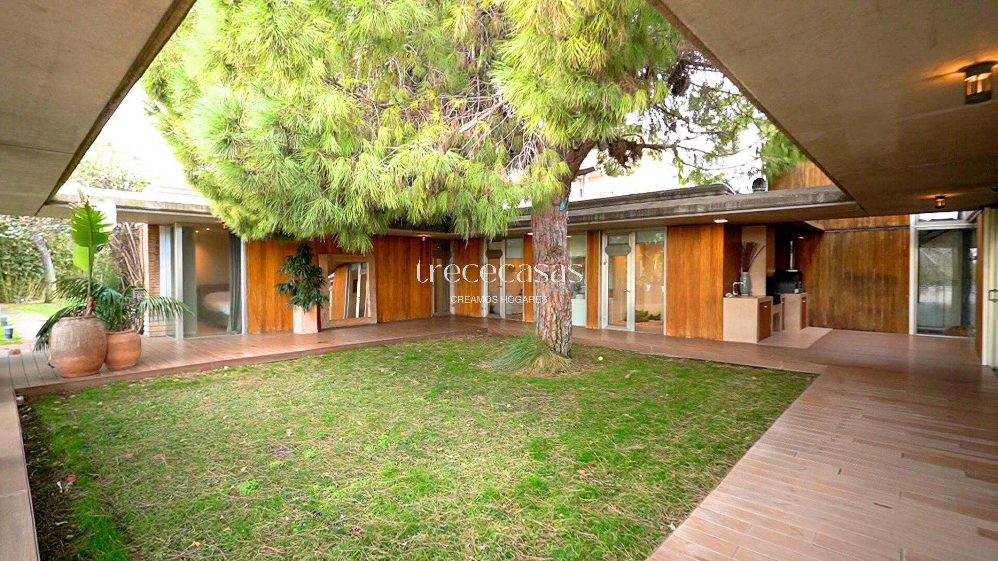 La vivienda se asienta sobre una parcela de 1.200 m² y ha sido proyectada por el arquitecto Julio Gómez Perretta. El diseño gira en torno a un pino centenario que estructura el conjunto y refuerza la integración entre arquitectura y paisaje. Desde el primer acceso, la casa transmite orden, equilibrio y coherencia espacial.