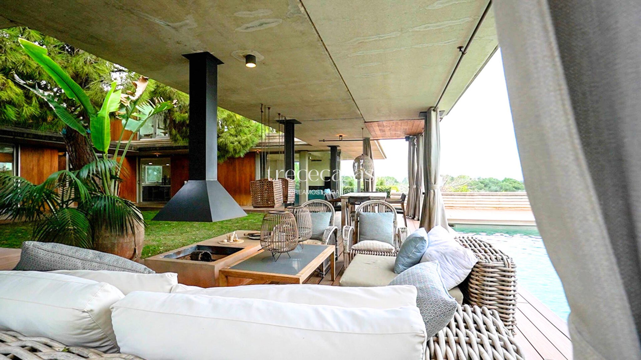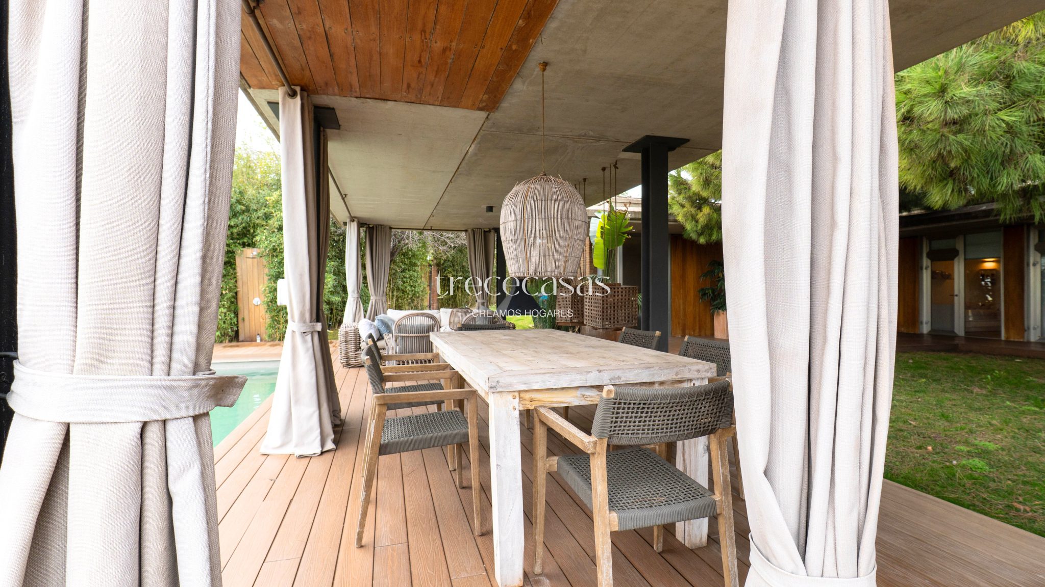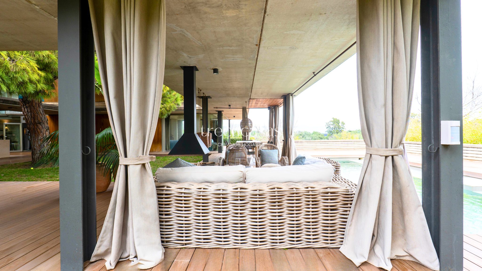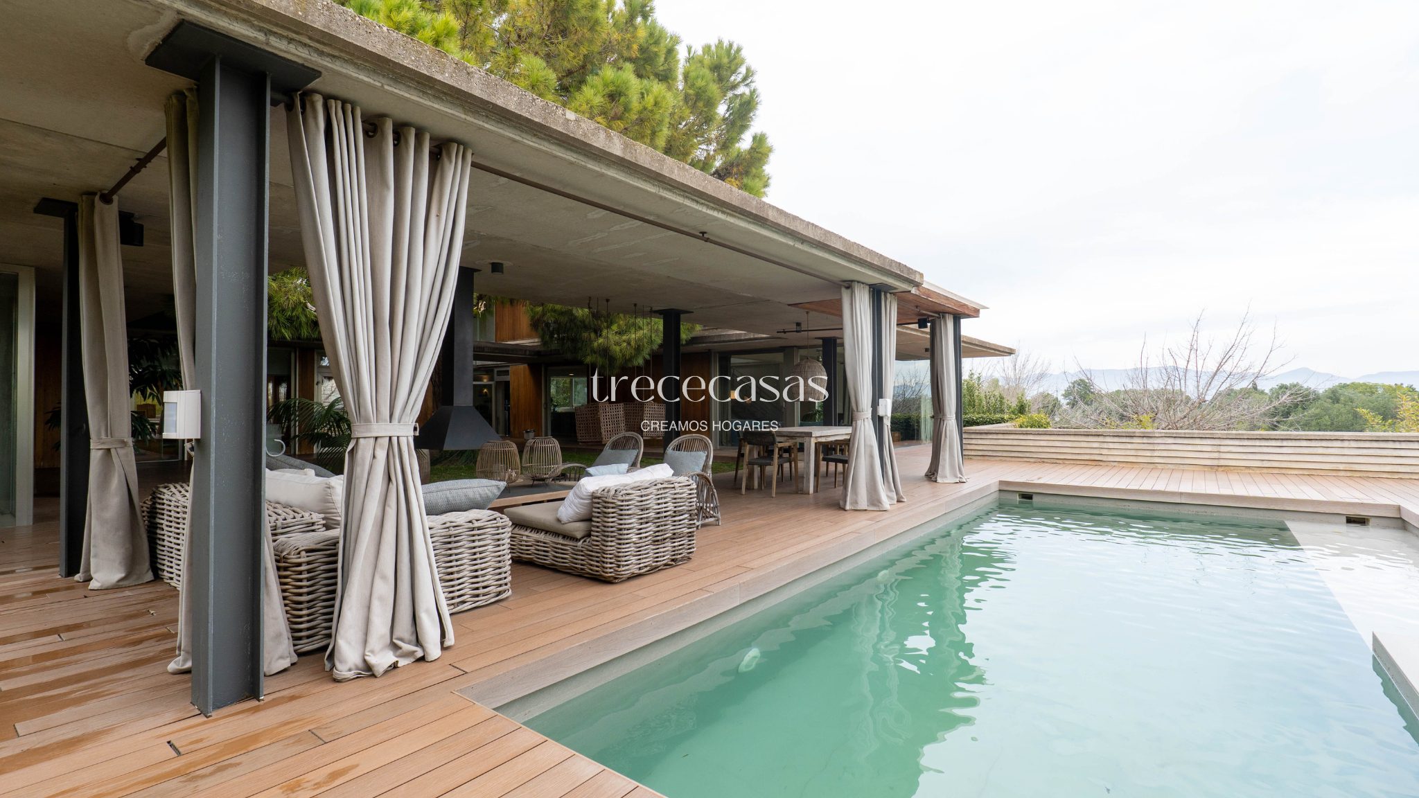 La terraza principal es amplia y funcional. Incluye chimenea exterior, zonas de estar diferenciadas y comedor al aire libre. La piscina se orienta hacia el campo de golf, lo que aporta vistas abiertas y una sensación constante de calma. Es un espacio pensado para disfrutar durante todo el año.