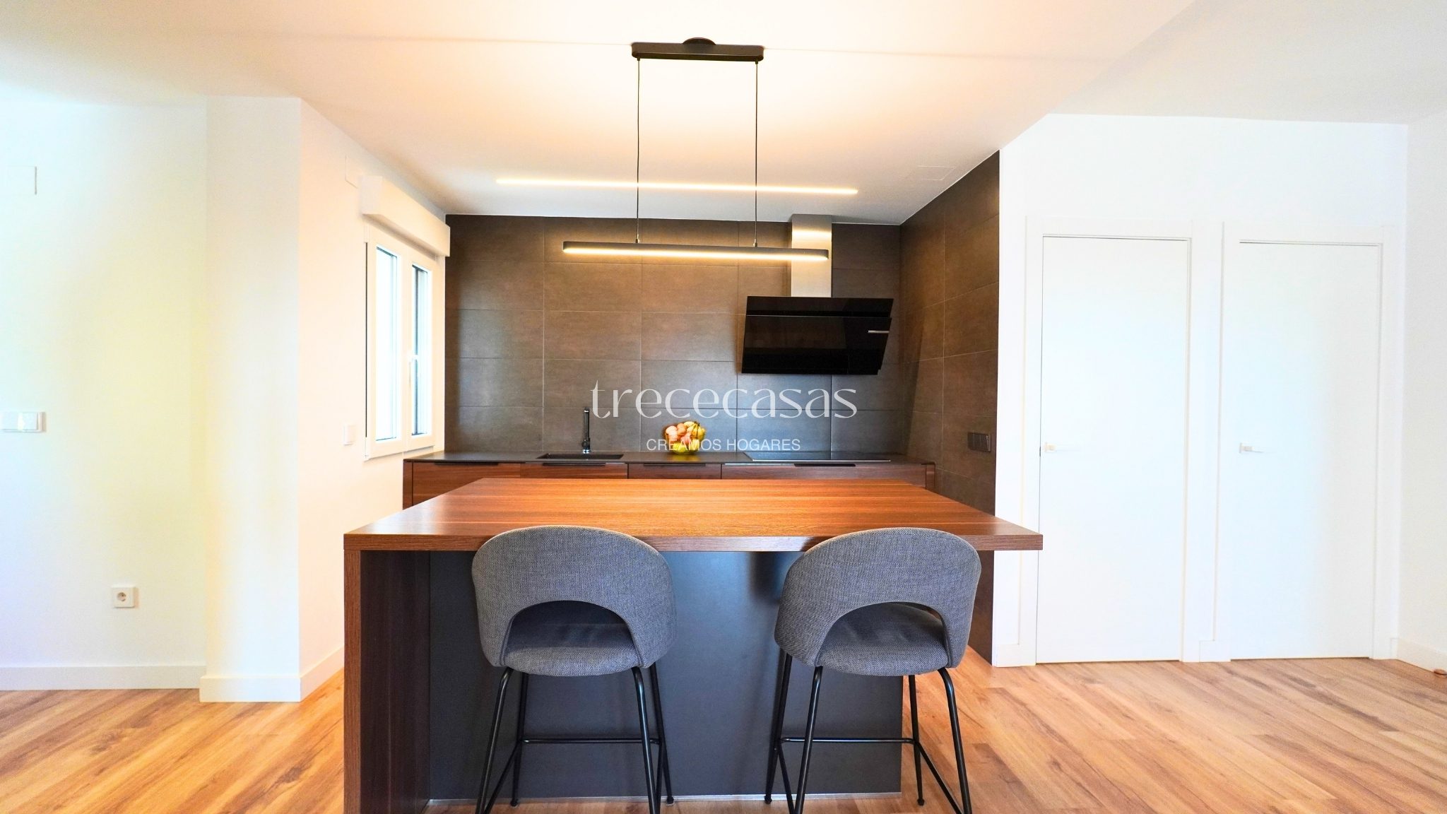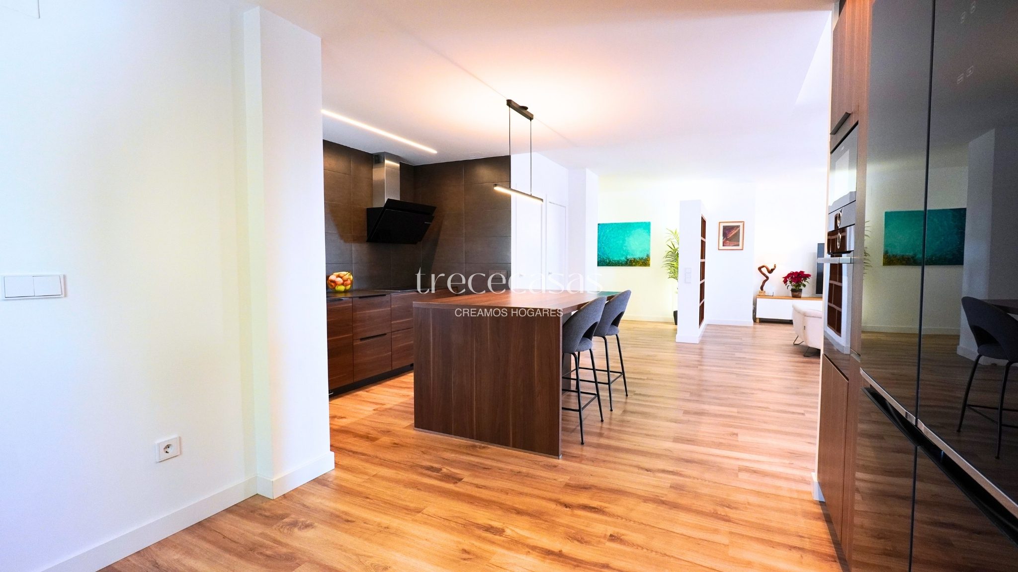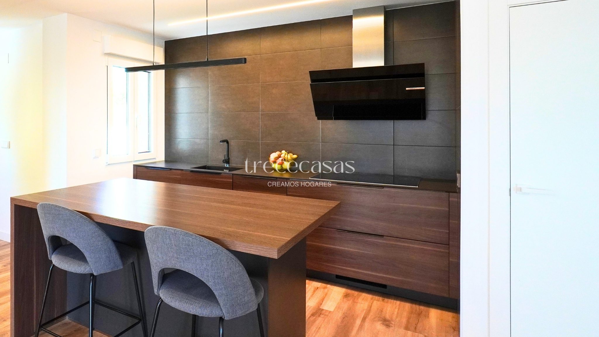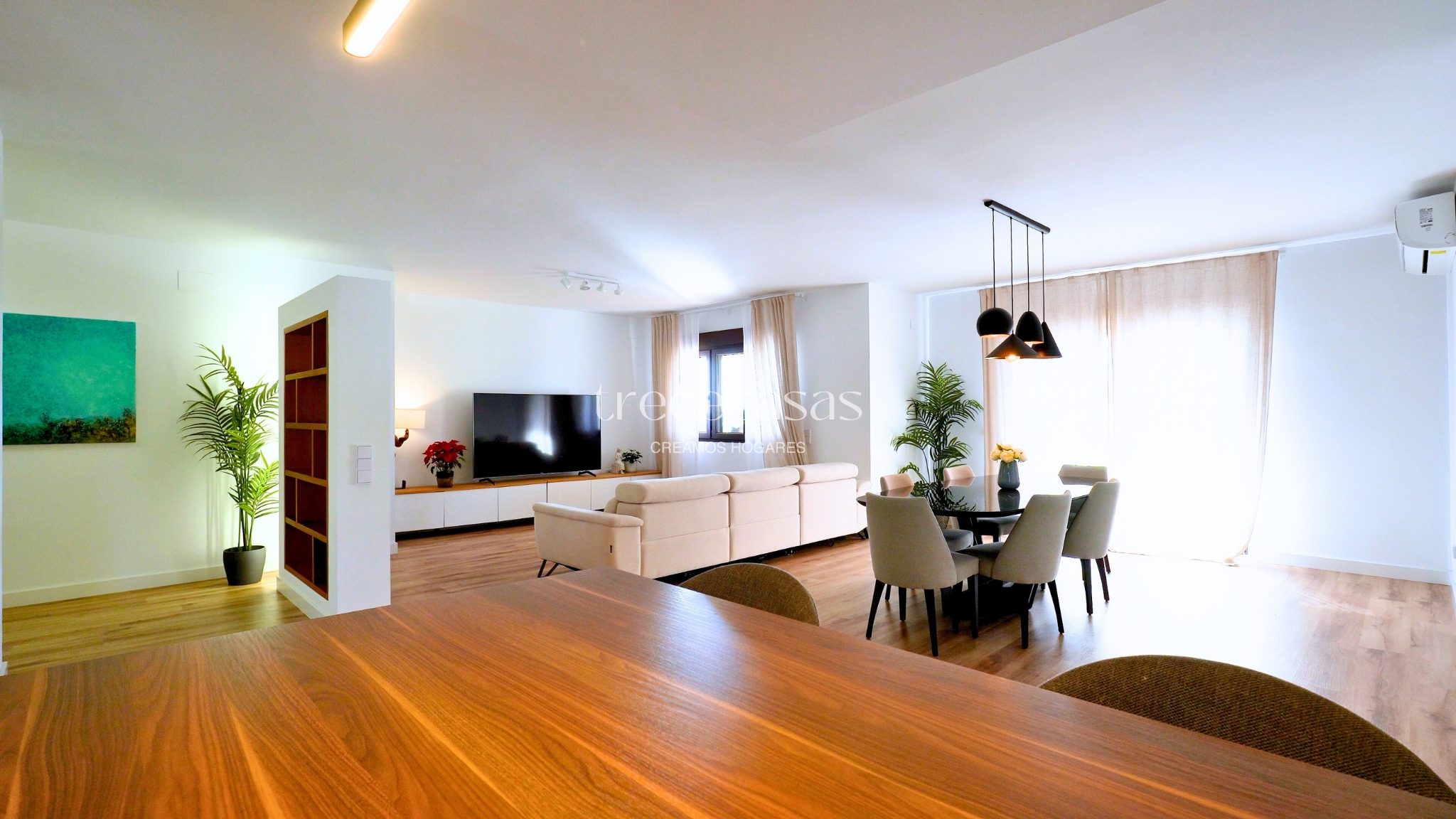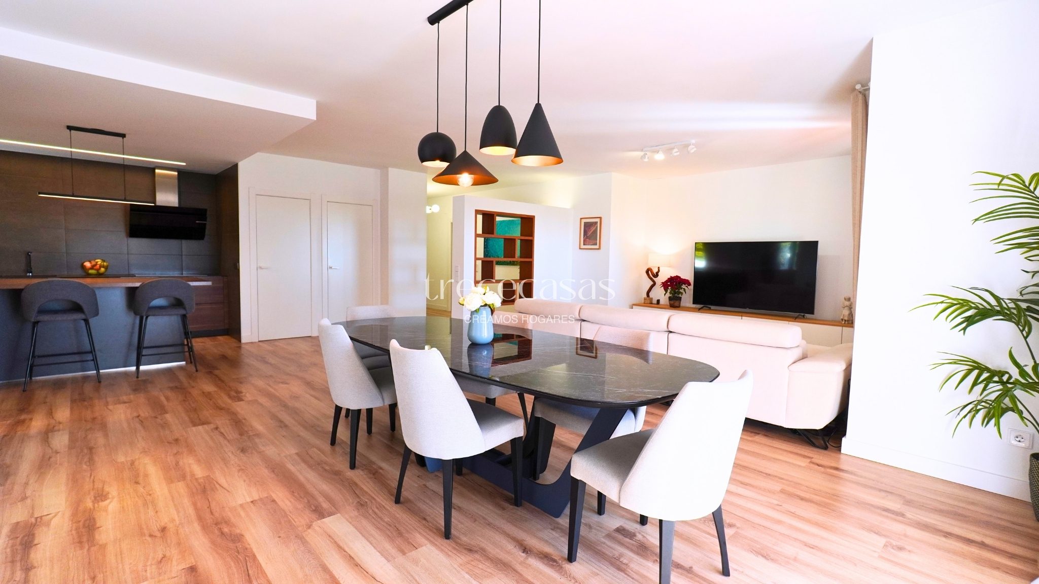 El salón comedor es amplio y muy luminoso. Mantiene una relación directa con el exterior, lo que facilita una vida diaria abierta y relajada. La cocina abierta se integra con el espacio social y permite cocinar y compartir sin interrupciones. Además, la conexión con la terraza amplía el uso del salón y facilita el acceso al jardín.