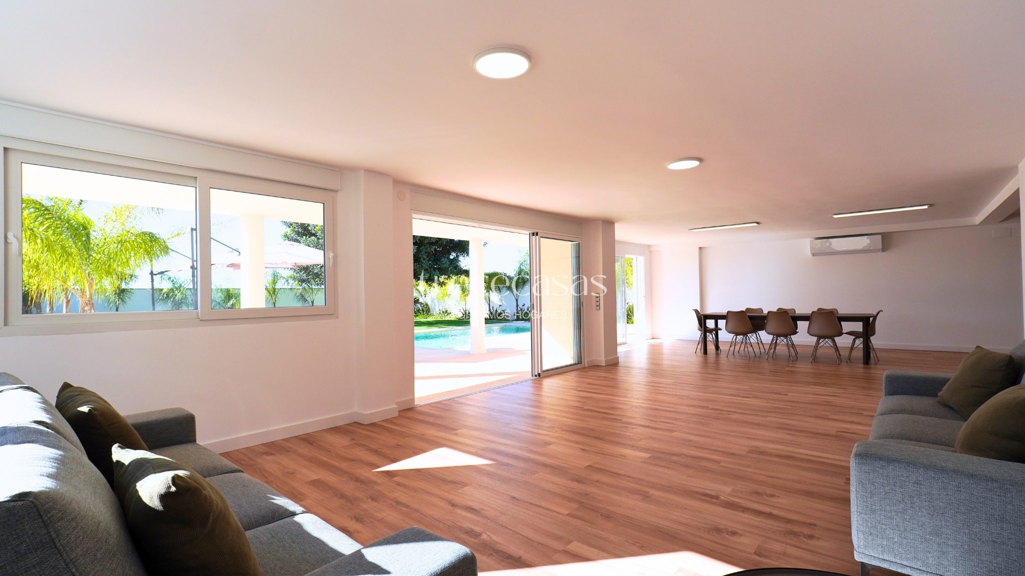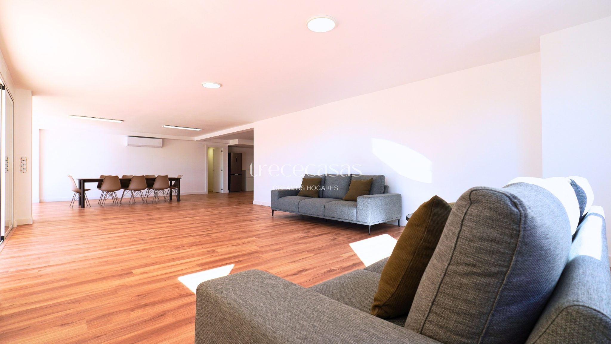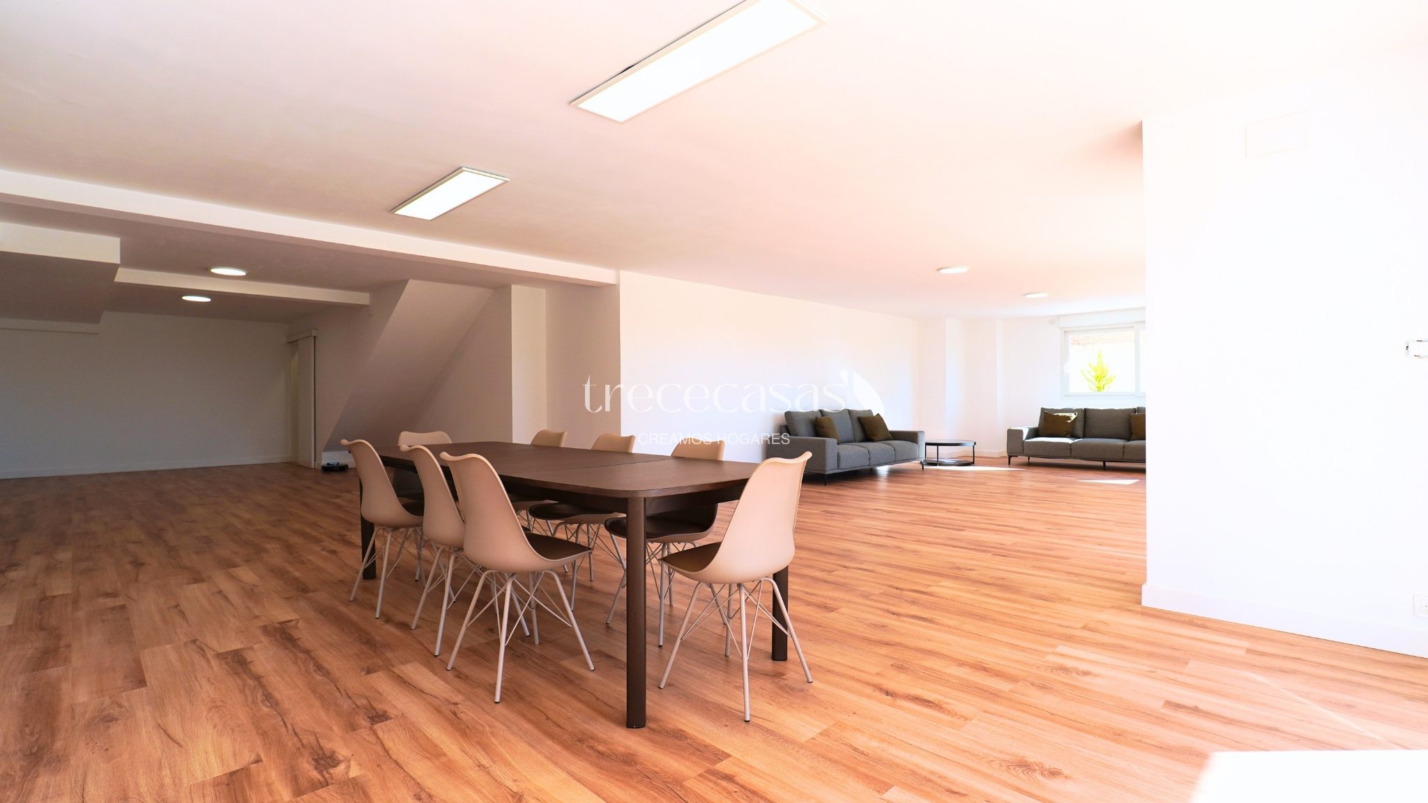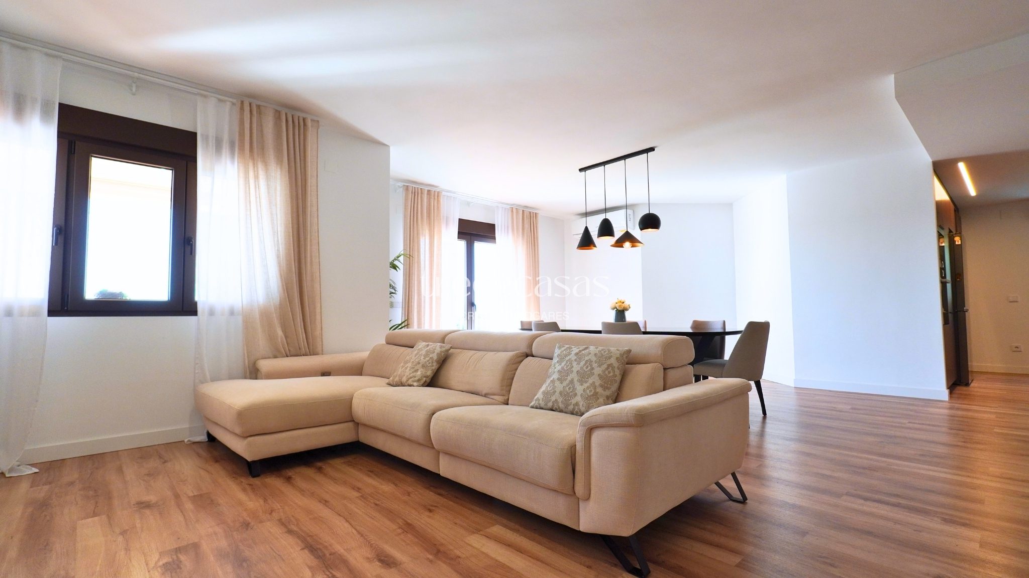 La propiedad cuenta con 496 m² construidos sobre una parcela de 1.051 m². La distribución está pensada para un uso cómodo y ordenado. Los espacios son amplios, bien proporcionados y permiten una circulación fluida. La luz natural acompaña cada estancia y refuerza la sensación de amplitud.