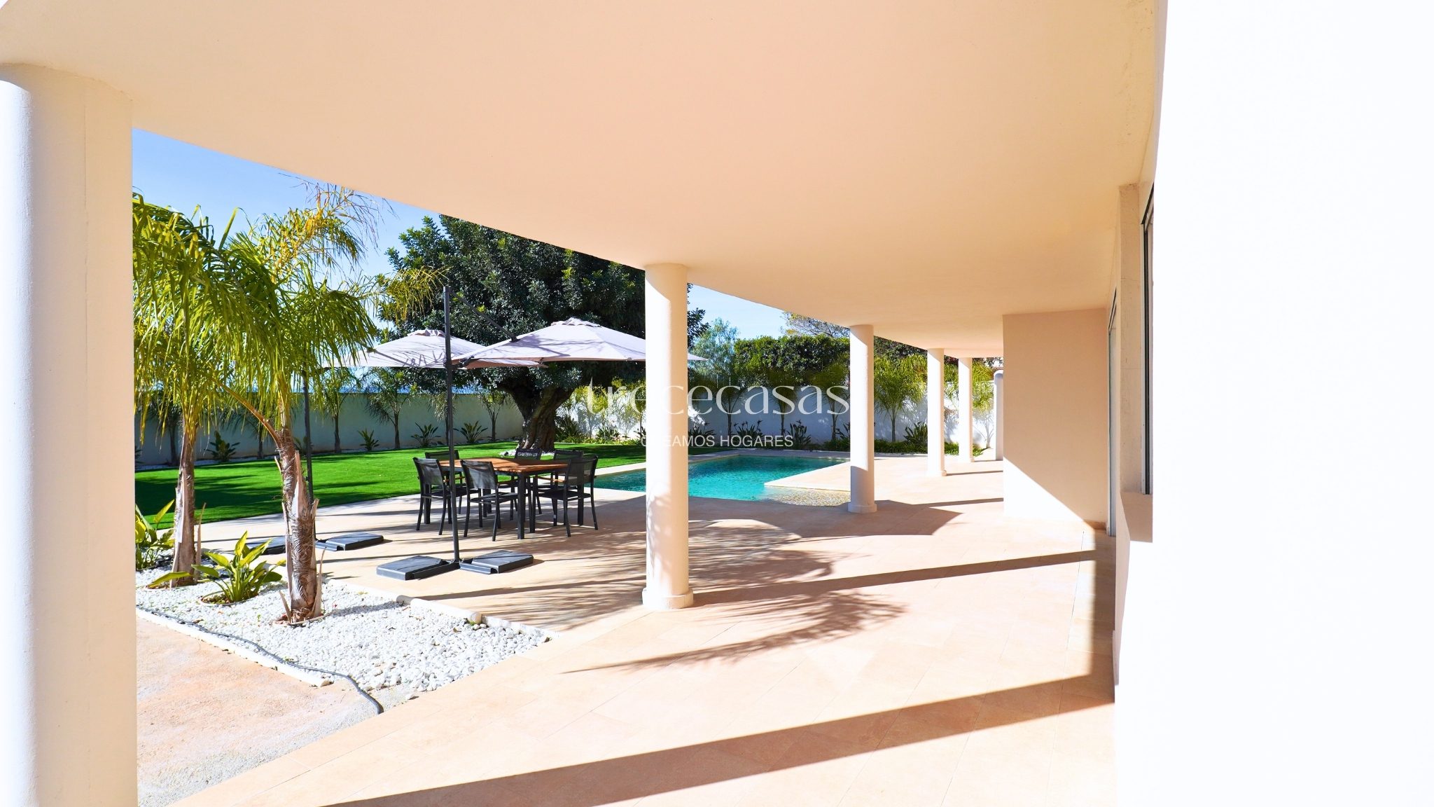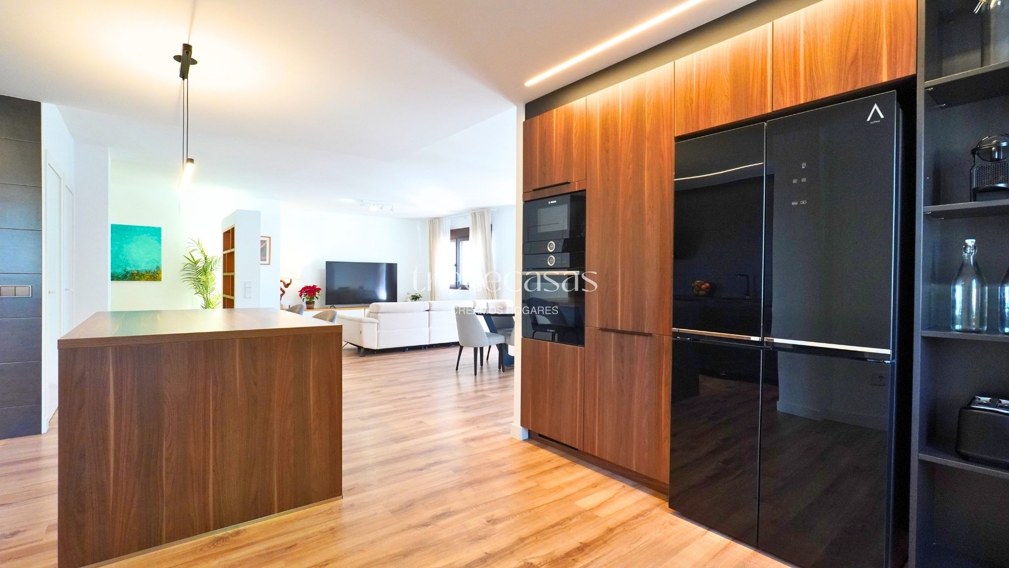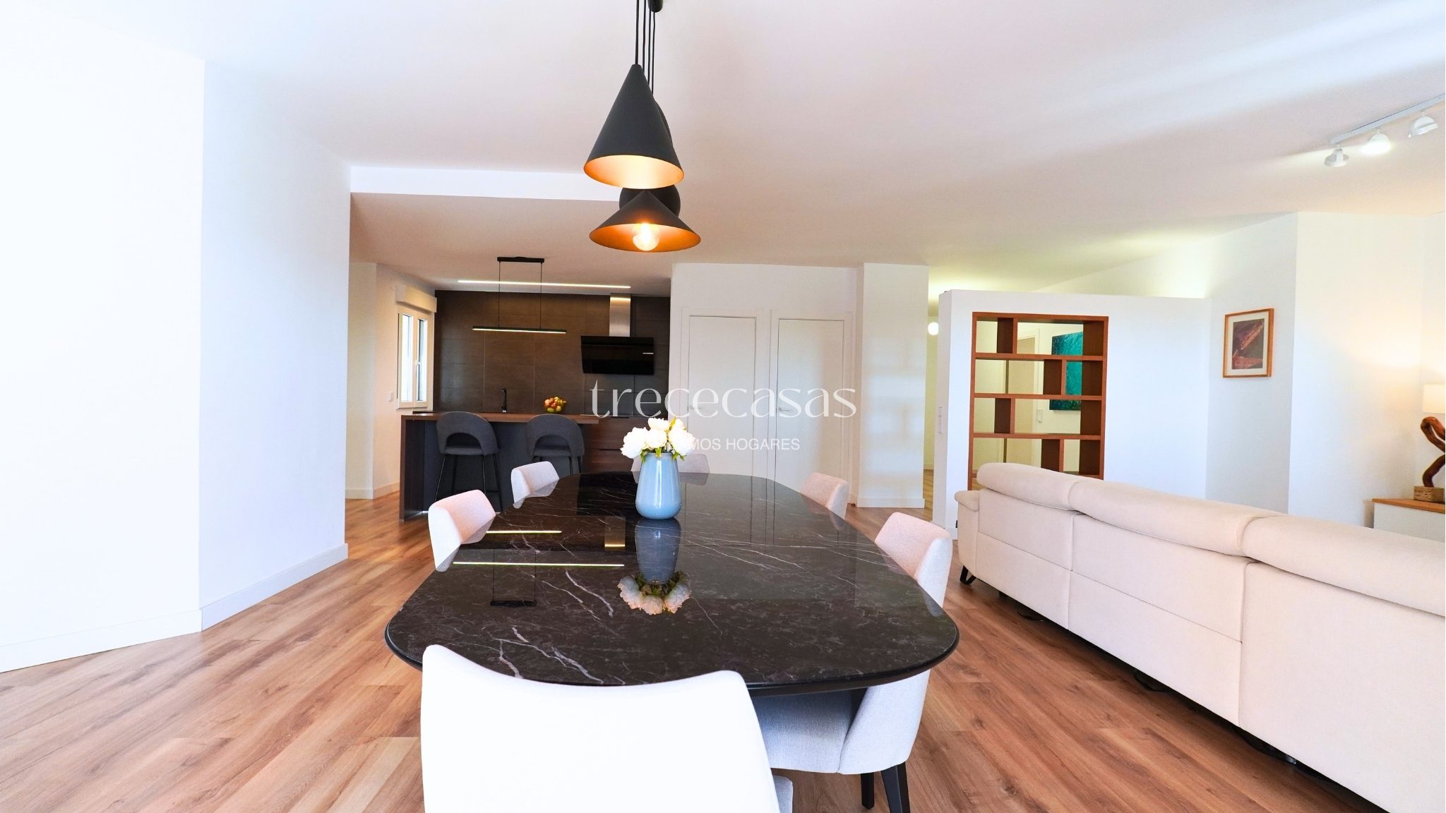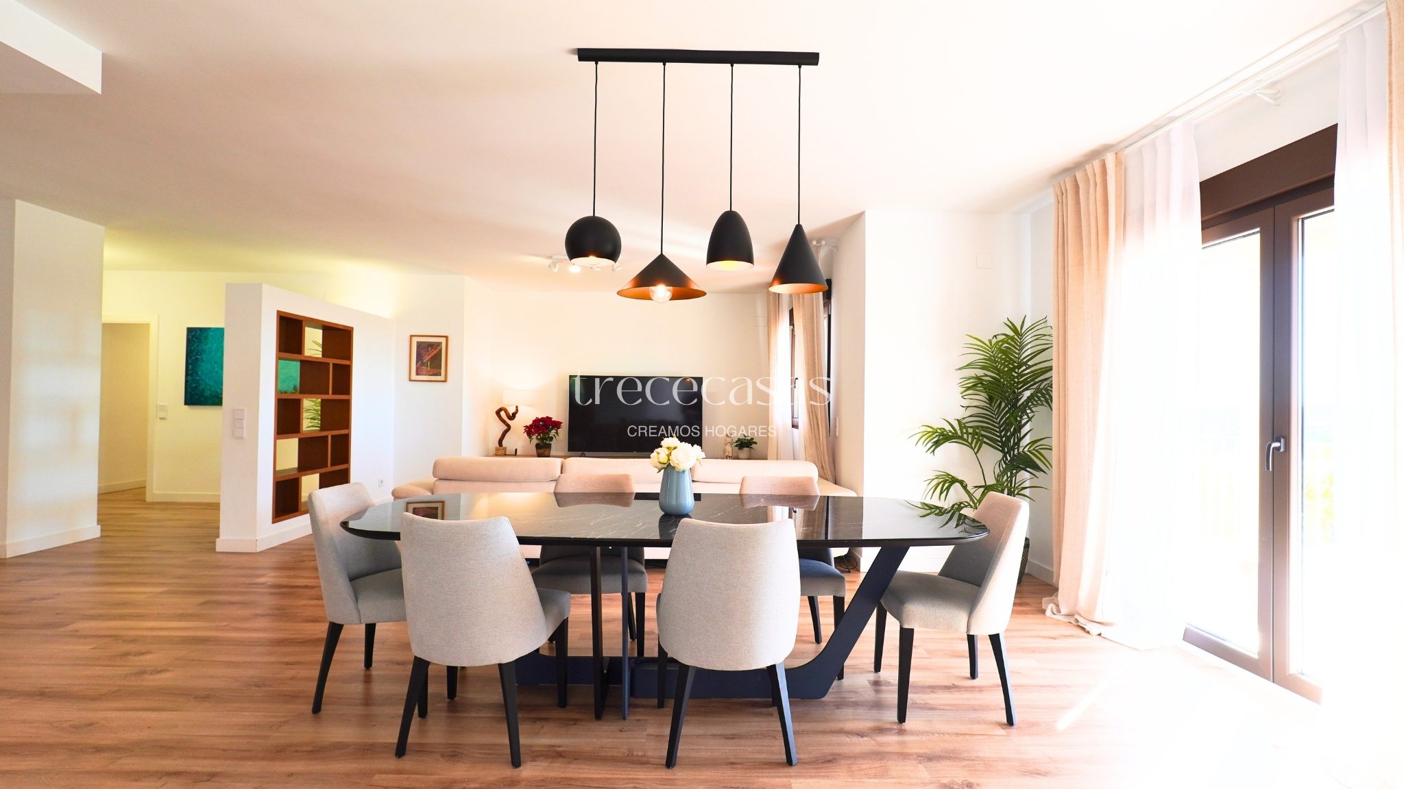 La propiedad cuenta con 496 m² construidos sobre una parcela de 1.051 m². La distribución está pensada para un uso cómodo y ordenado. Los espacios son amplios, bien proporcionados y permiten una circulación fluida. La luz natural acompaña cada estancia y refuerza la sensación de amplitud.