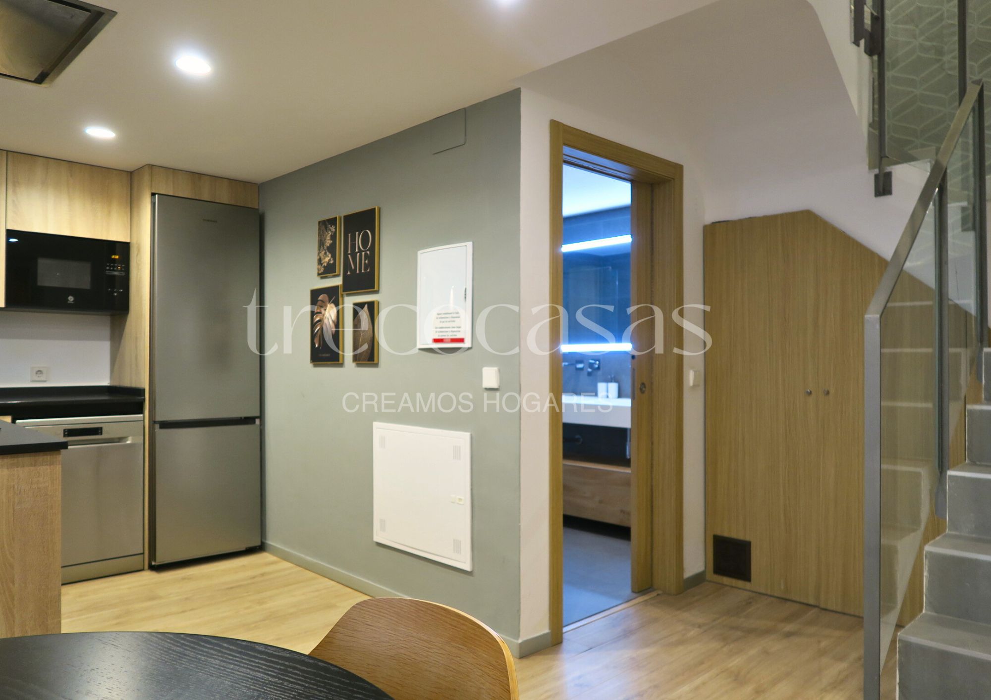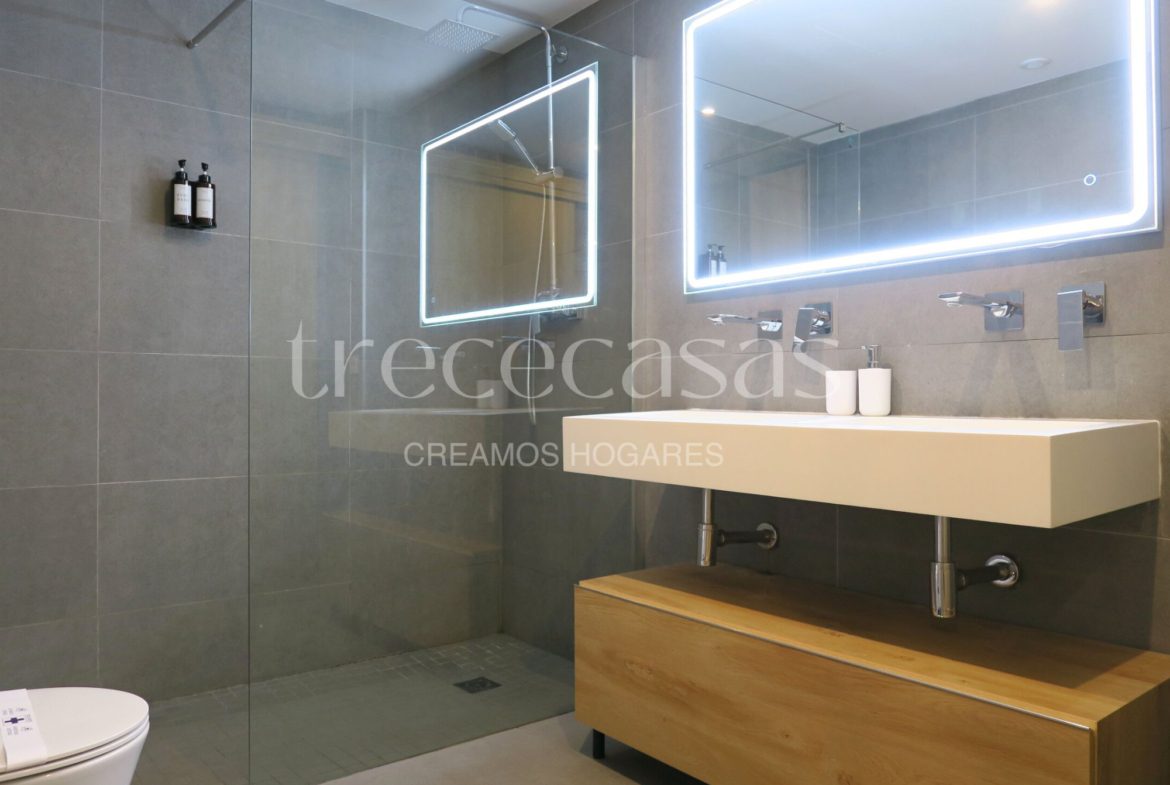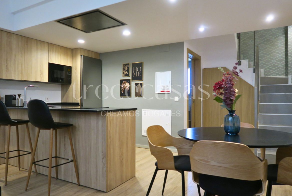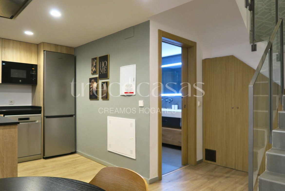 La planta baja reúne comedor, cocina y baño. El comedor tiene una forma regular que facilita la colocación del mobiliario y permite adaptar el espacio a distintos estilos. La cocina integrada incorpora muebles actuales que favorecen un uso práctico y ordenado, algo que se agradece en viviendas de este tipo. Por otro lado, el baño combina elementos modernos con una iluminación suave que crea una atmósfera cómoda para las rutinas diarias. La verdad es que este nivel ofrece una circulación fluida y una sensación de amplitud sin elementos innecesarios.