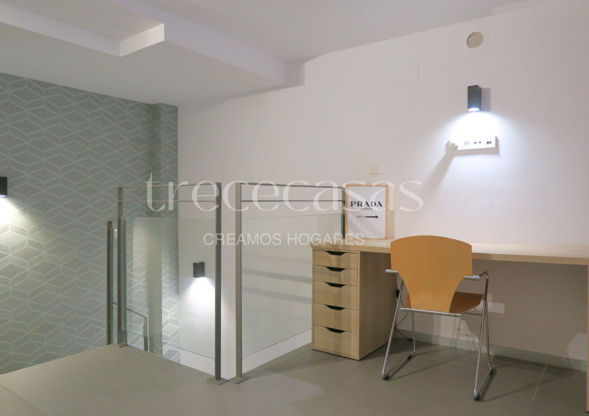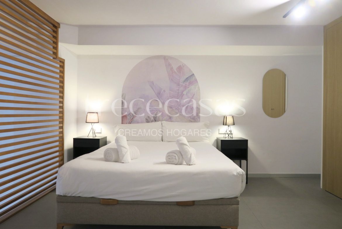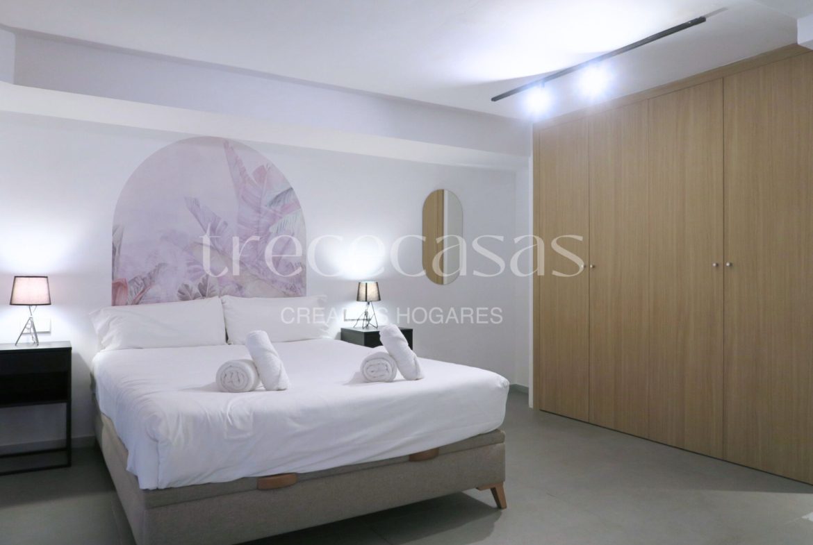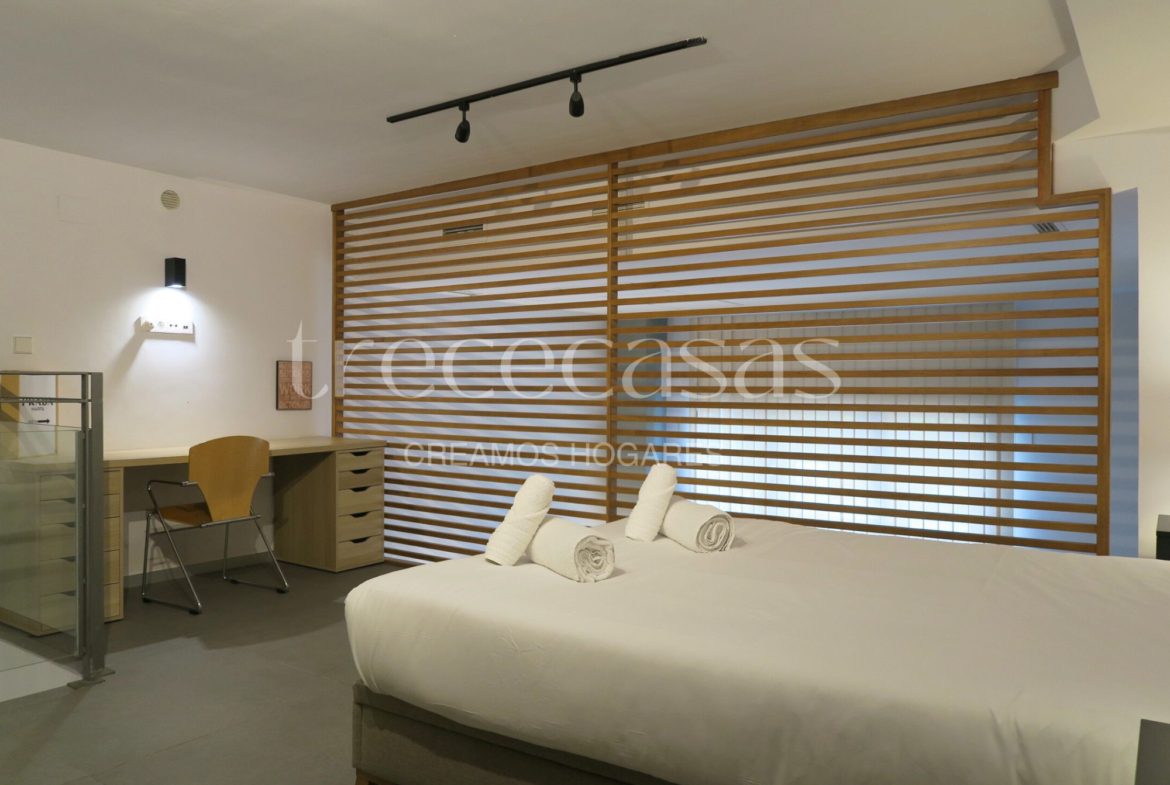 La planta superior está destinada al dormitorio. Es un espacio tranquilo, con altura suficiente para mantener una atmósfera íntima y serena. El mobiliario incluido facilita una instalación inmediata y permite mantener el orden sin esfuerzo. Además, la separación entre ambas plantas mejora la dinámica del día a día: abajo se vive, arriba se descansa.