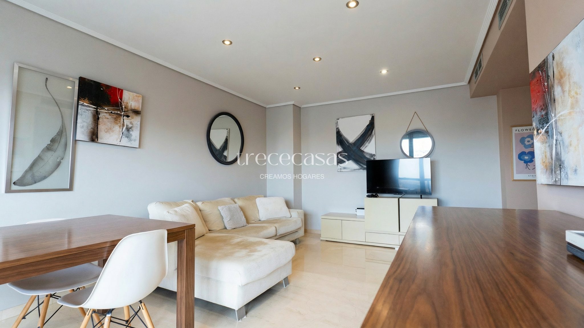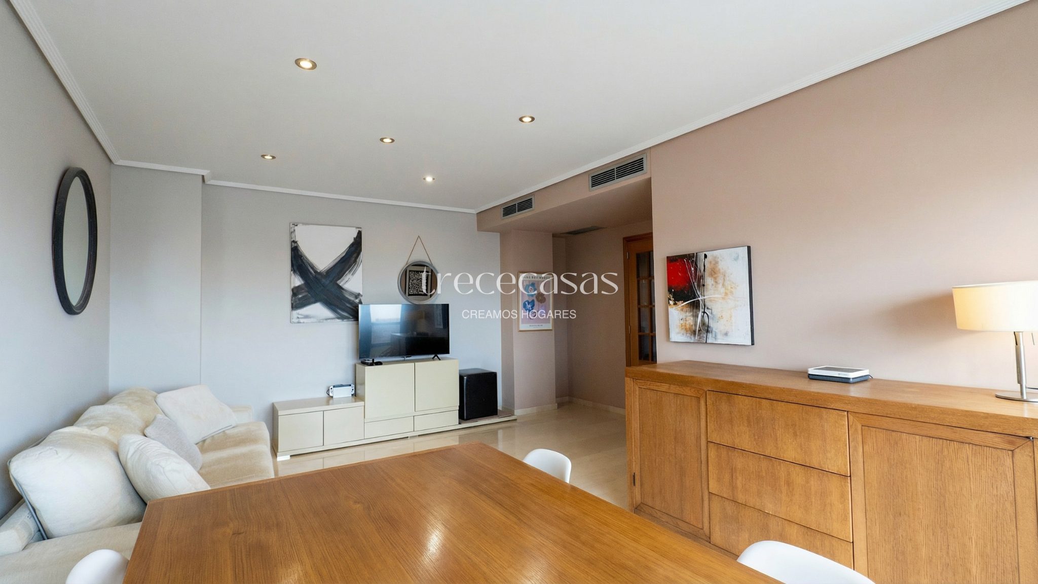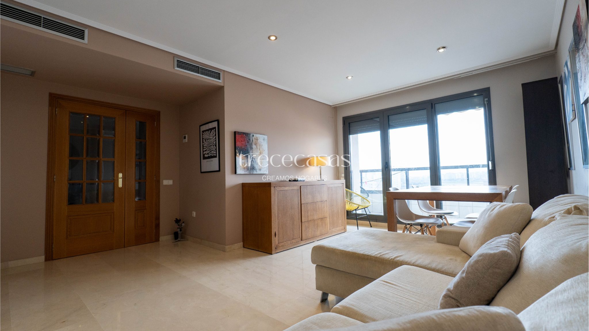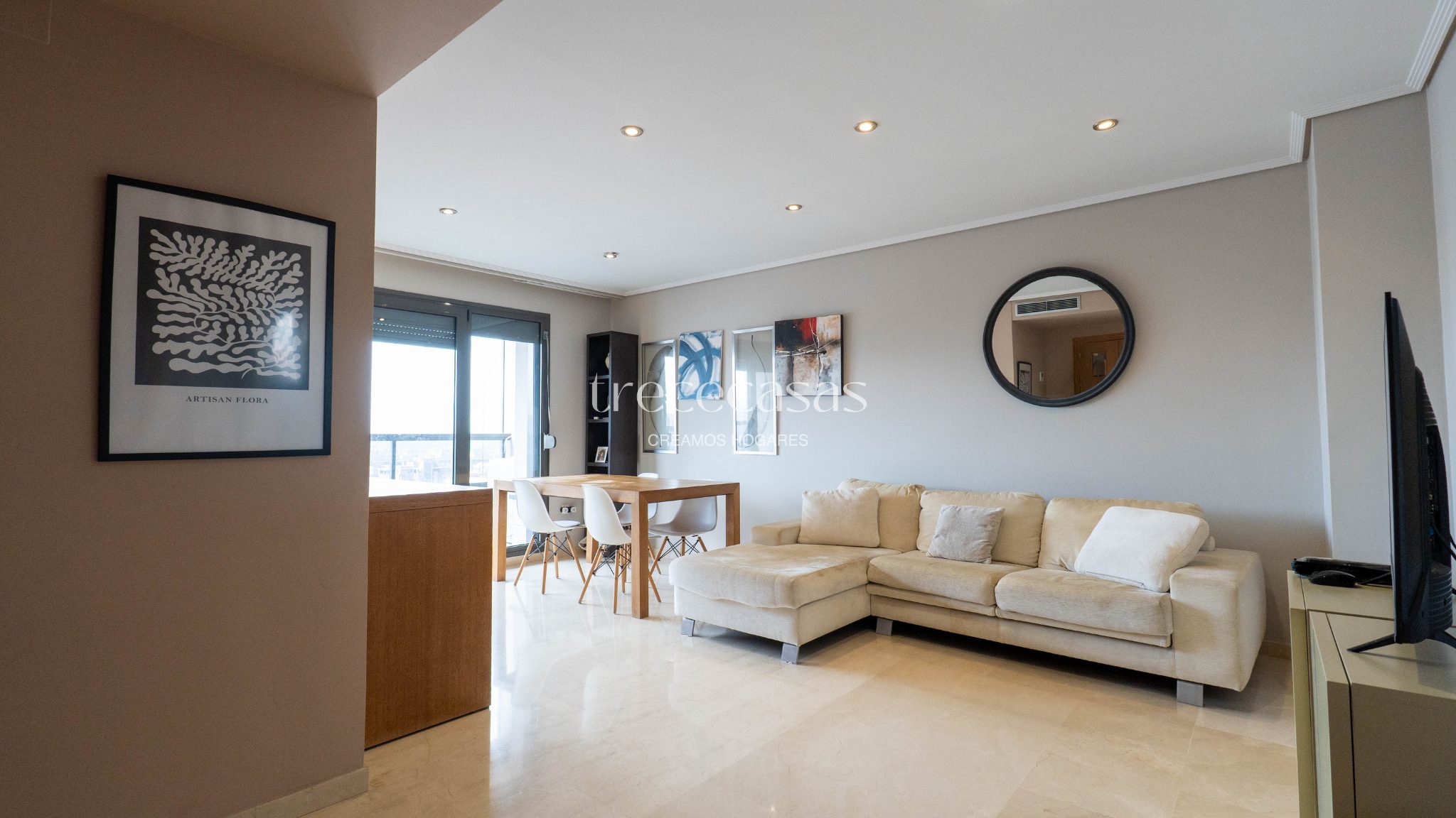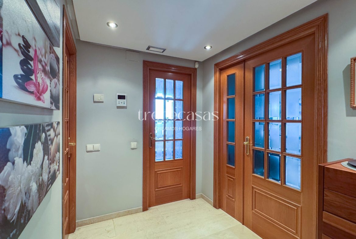 Desde la entrada se percibe orden y claridad. El salón, amplio y bien iluminado, conecta directamente con la terraza. Por lo tanto, la vivienda mantiene una relación natural con el exterior y permite disfrutar de la luz durante gran parte del día.