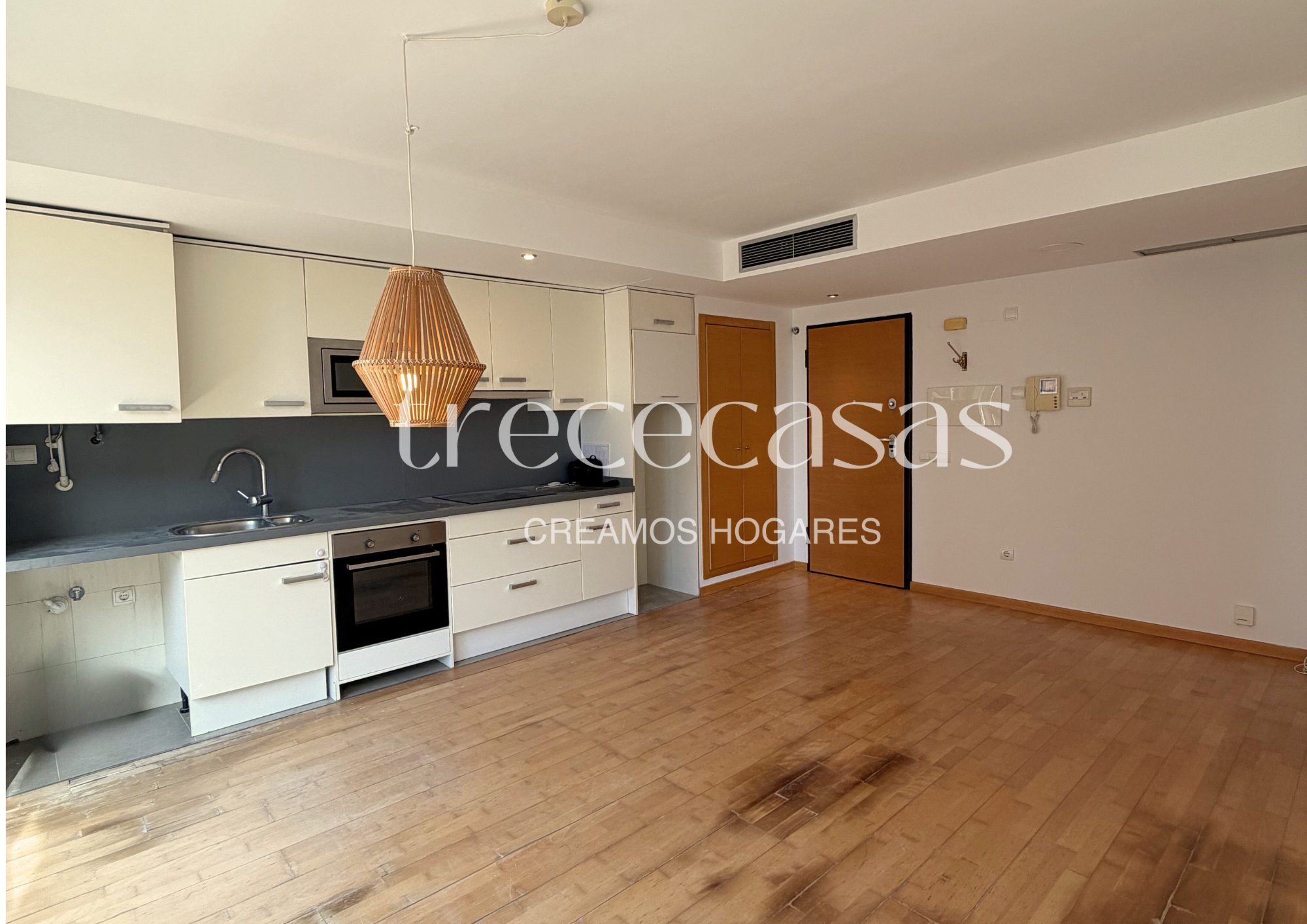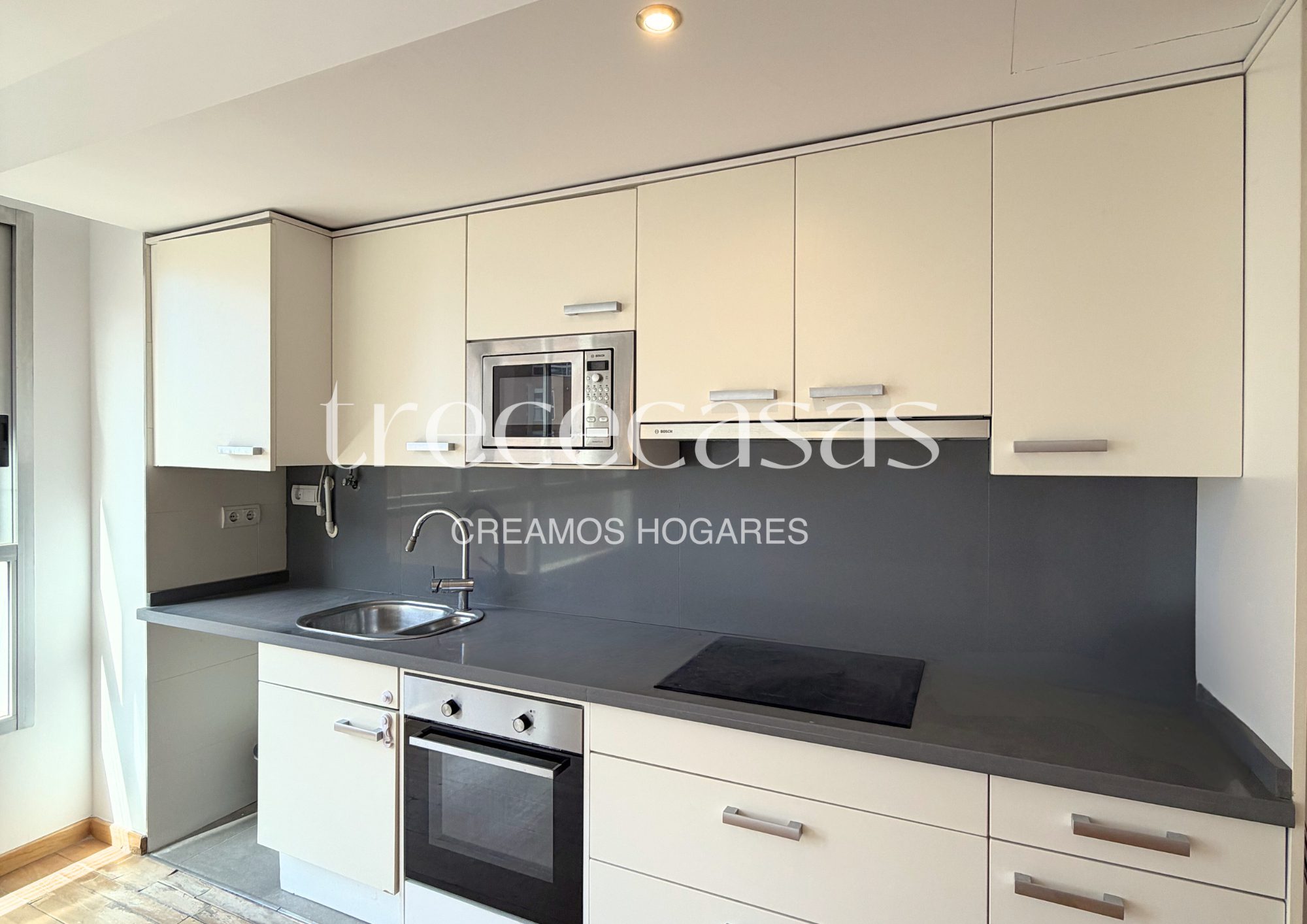 La cocina se integra de forma natural en el conjunto de la vivienda. Su diseño facilita el uso diario y mantiene una organización clara del espacio. Además, el suelo de parquet aporta continuidad visual y una sensación cálida en todas las estancias.
