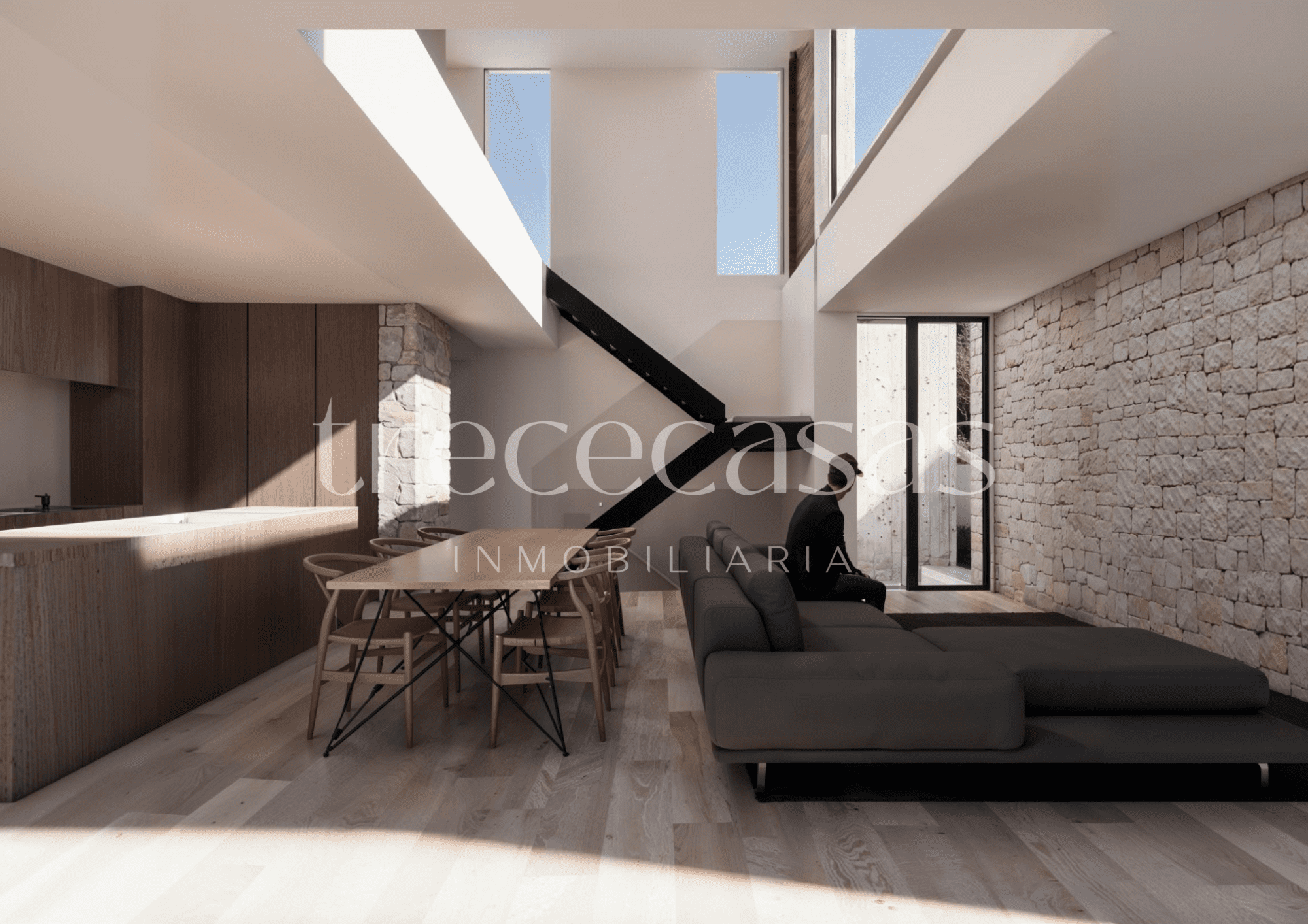 La casa presenta una estética mediterránea bien definida. La piedra natural en el exterior y la madera en el interior aportan calidez, carácter y una imagen atemporal. Desde el primer momento, la vivienda transmite orden y una relación directa con el entorno natural que la rodea.
