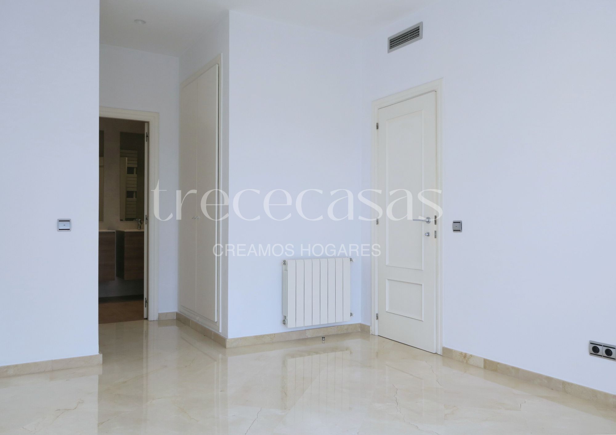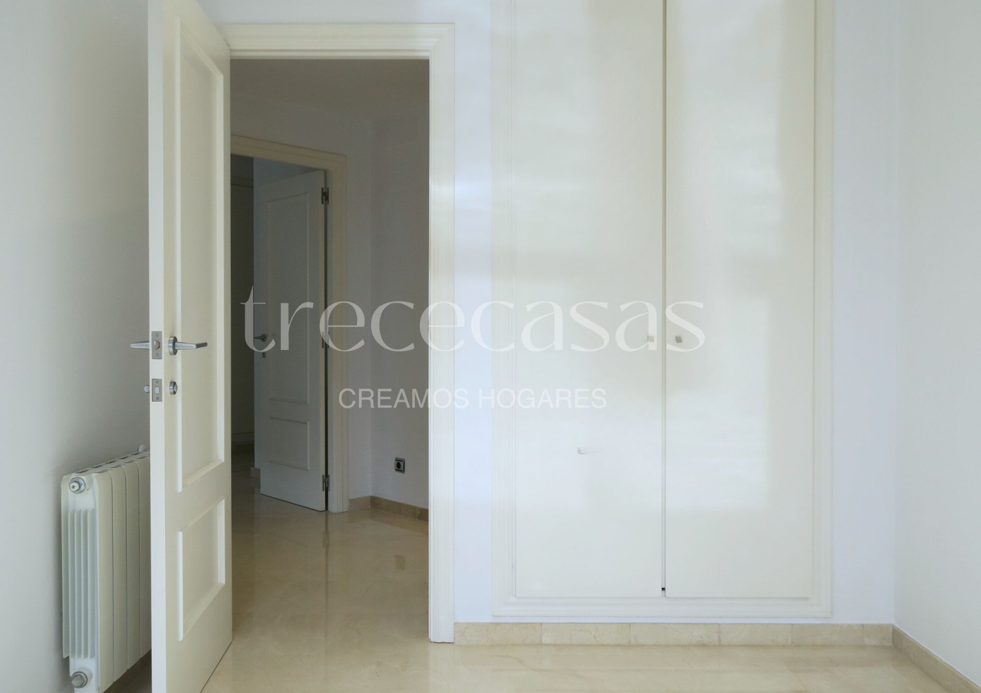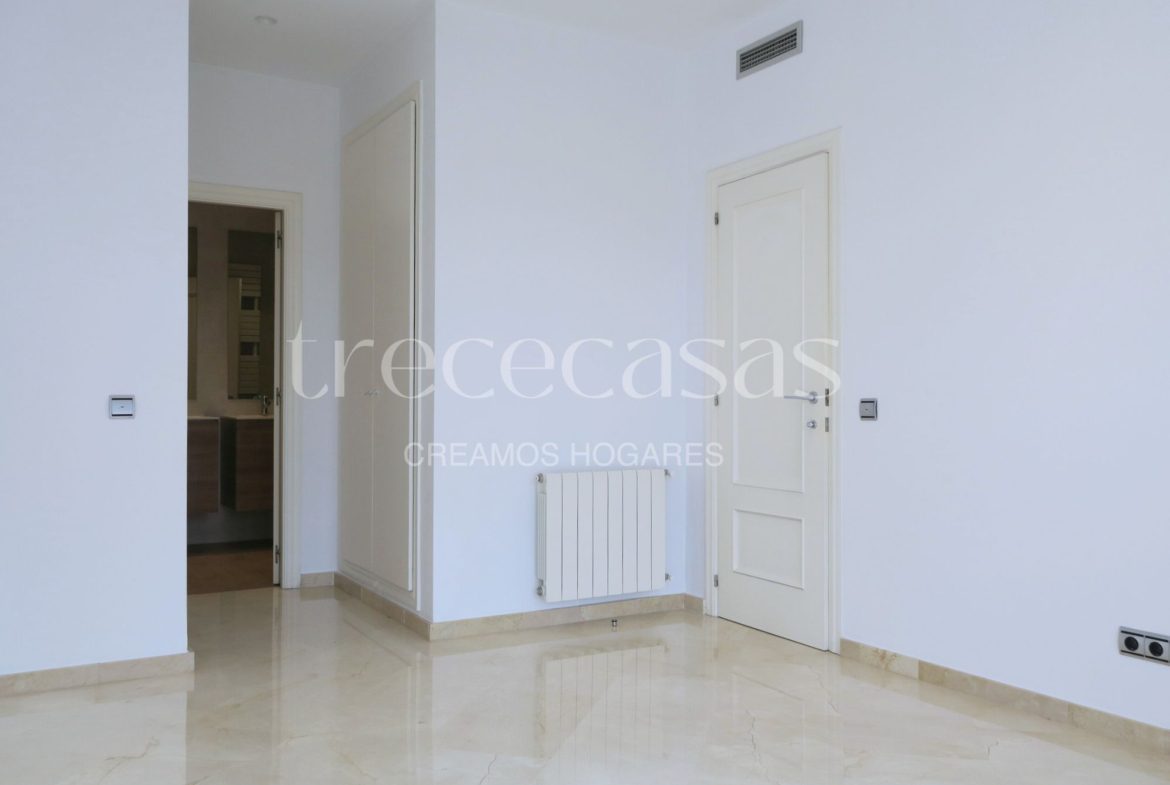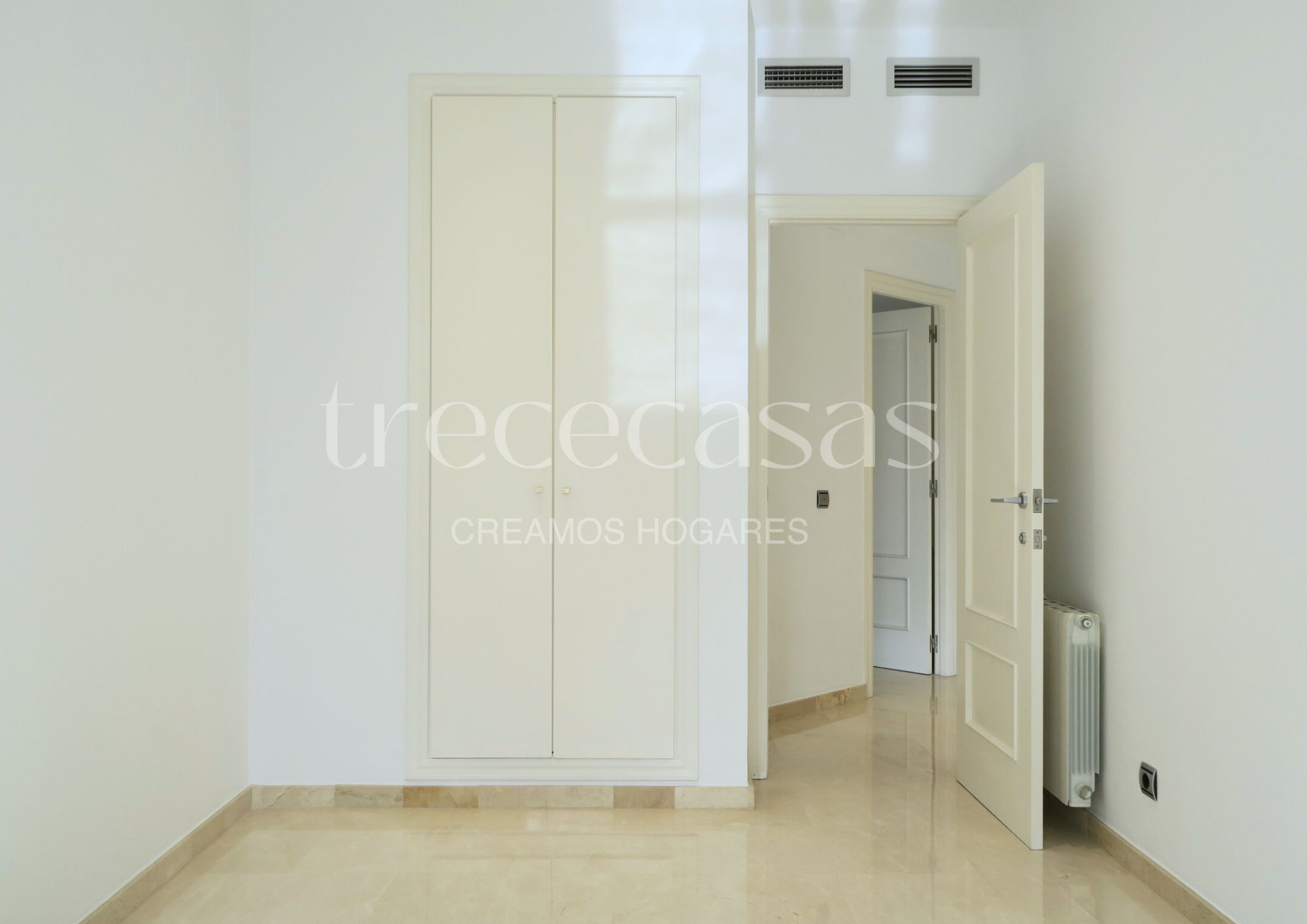 Los suelos de mármol, la carpintería lacada en blanco y los acabados neutros aportan una sensación de elegancia y continuidad en todas las estancias. La vivienda dispone de aire acondicionado por conductos y calefacción por radiadores, garantizando confort en cualquier estación del año.